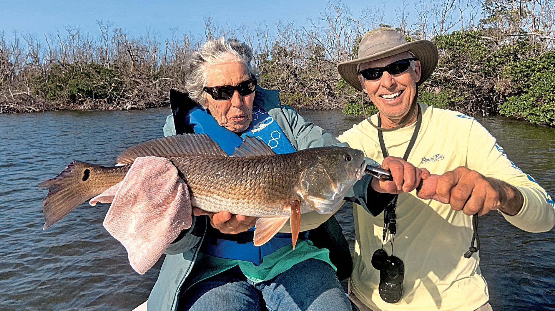 Fishing on her 91s birthday recently, Jeanette Bennett caught this 25 1/2-inch redfish in Pine Island Sound. She was fishing with her son, Frank Bennett, and used a white paddle tail artificial bait to land her prize. Despite the windy conditions that day, it was a successful trip and a forever memory for them both.