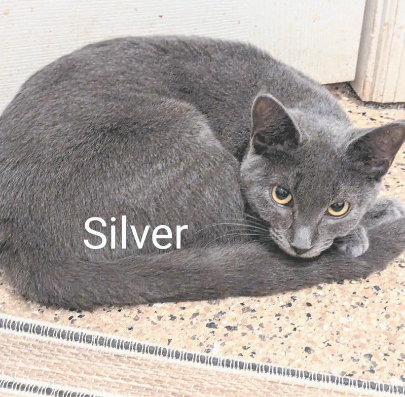 Silver is a female dark gray kitten. She loves to play and is full of energy. She is 10 months old and ready for a forever home and would be good with other cats or kittens.