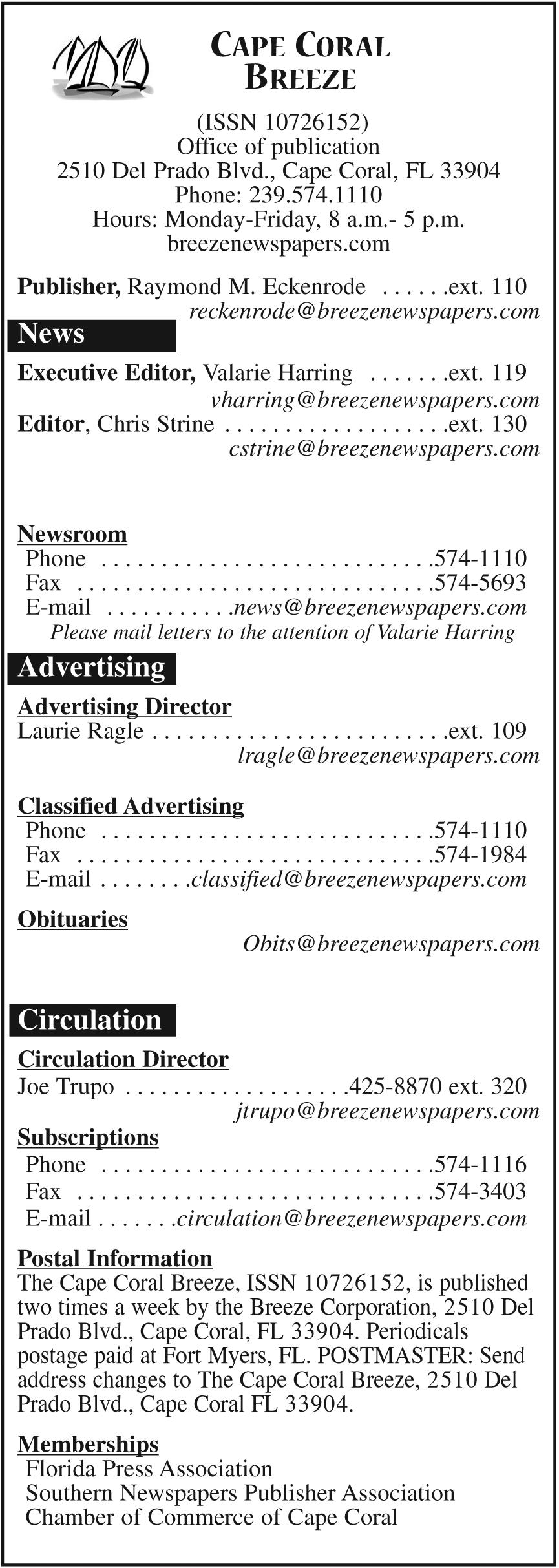 C a p e C o r a l B r e e z e w w w . c a p e c o r a l b r e e z e . c o m A p r i l 2 1 , 2 0 2 3 ■ P a g e 2 Cape Coral Breeze Vol. 6 2 , No. 3 2
