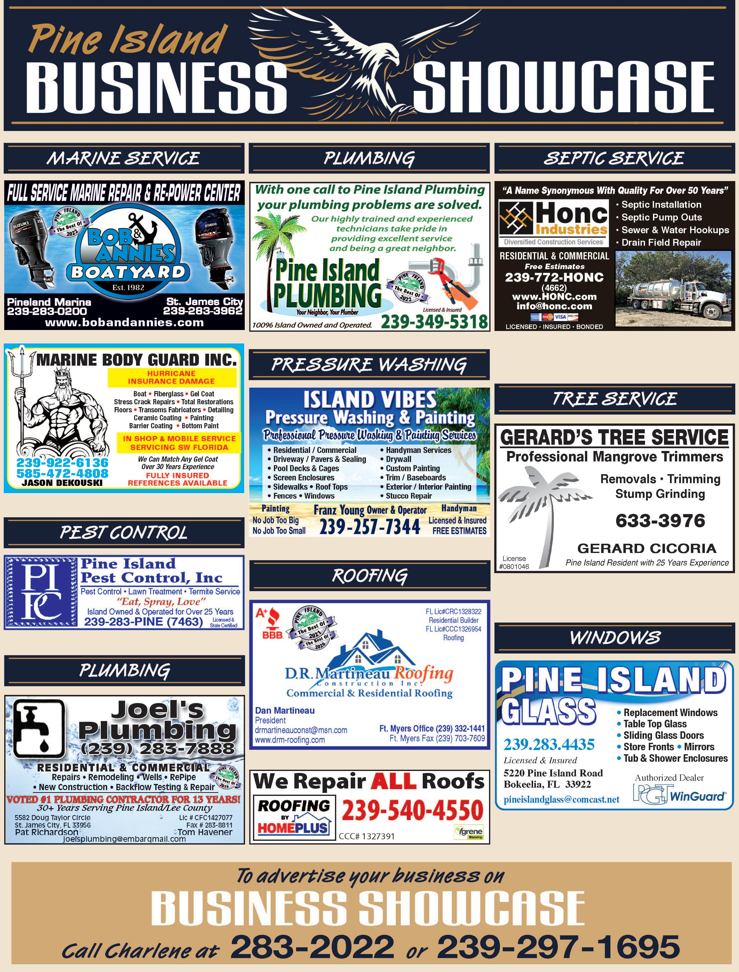 P a g e 1 9 ■ W e e k o f W e d n e s d a y , A p r i l 2 6 , 2 0 2 3 b r e e z e n e w s p a p e r s . c o m P i n e I s l a n d E a g l e Plumbing Screening Sprinkler Systems & Irrigation Tree Service UltraPlumbing &DrainCleaning,Inc PlumbingInstallations ServiceandRepair 24/7EmergencyServices DrainBack-Ups PipeBursts Residential&Commercial Honest-Professional Affordable Veteran&SeniorDiscounts FreeEstimates 239-203-7047 FacebookandInstagram @ultraplumbingservice Licensed&InsuredLic#CFC1430549 YourServicePlumber ForAllYourPlumbingNeeds WellPumps R.O.Systems WaterSofteners R e-PipeSpecialist Sewer&WaterHookUps $50.00off anyserviceover$250.00 Over25YearsExperience Veteran&SeniorDiscounts FreeEstimates 239-940-7978 CreditCardsAccepted License#CFC1430070 AFFORDABLE FREE ESTIMATES NewInstallation IncludesPermit 2YearWarranty RainBirdContractor A+RATED-ANGIESLIST Installation&Repair Licensed&Insured FAMILYOWNEDSINCE1981 LEE#LSO200031 CAPE#06938 Sanibel#S11-000923 Tony’s