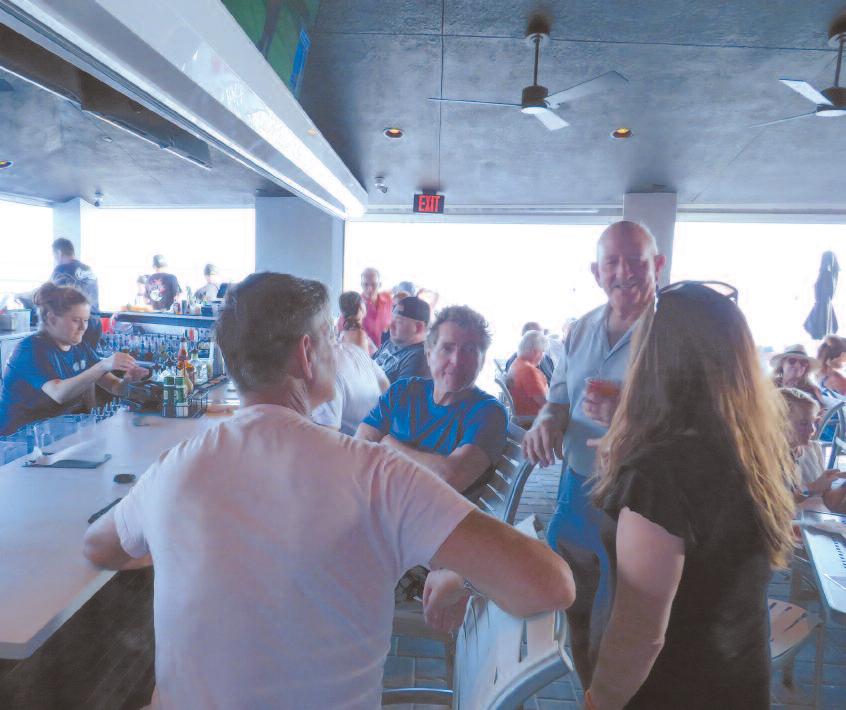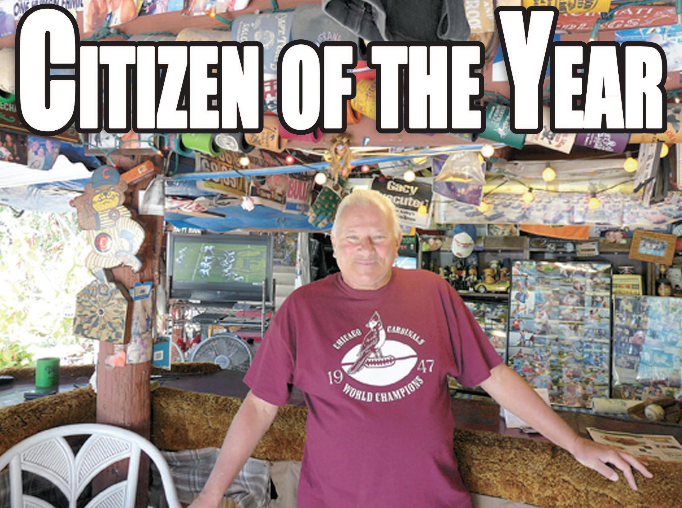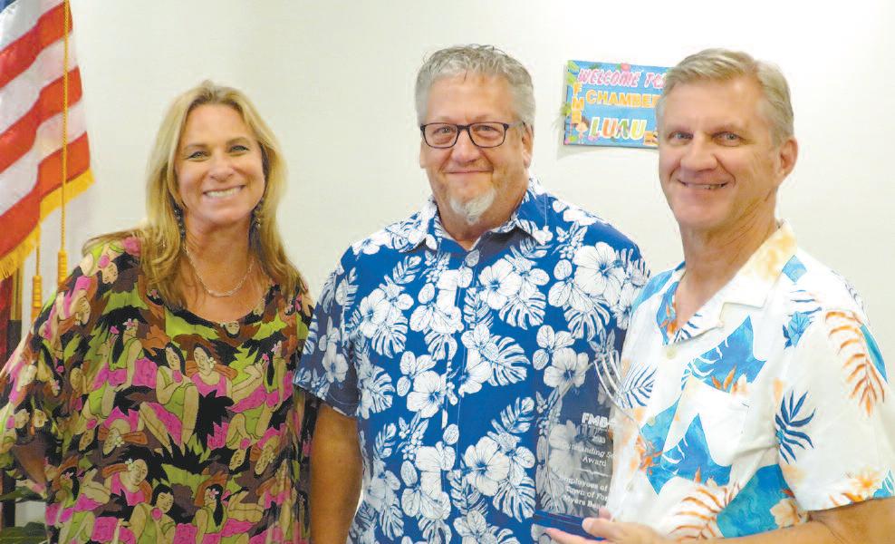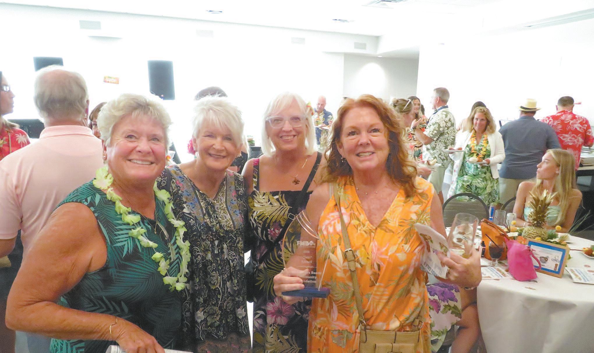 The Fort Myers Beach Chamber of Commerce honored the late Mitch Pacyna with their 2023 Citizen of the Year Award. Pacyna, seen at the community bar he converted out of his Fort Myers Beach home, drowned during Hurricane Ian His longtime partner Mary Wojciechowski (with her and Pacyna's Fort Myers Beach neighbor Robert Campbell), accepted the honor on his behalf during the chamber banquet at the DiamondHead Beach Resort on Friday PHOTOS PROVIDED
