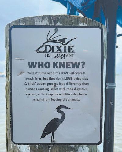 Kudos to Dixie Fish Company for posting this sign prominently in their local bayside restaurant. By asking their patrons not to throw any type of foodstuff to our birds, they help the birds to stay healthy By only viewing and not feeding the birds, they are encouraged to go find their own natural healthy food in the wild areas nearby This practice also limits the amount of bird mess left on the nearby furniture and eating areas, as well as the stuff fouling the marina water Thanks to Dixie Fish for this great sign idea and supporting our local wildlife