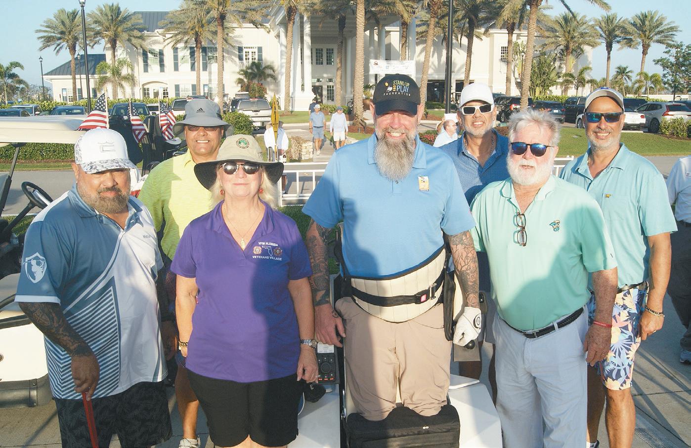 Retired U.S. Air Force Senior Master Sgt. Jim “Tip” Tipton, center, with event organizer Bob Booth and members of the Women Veteran Warriors and Fairway for Warriors.