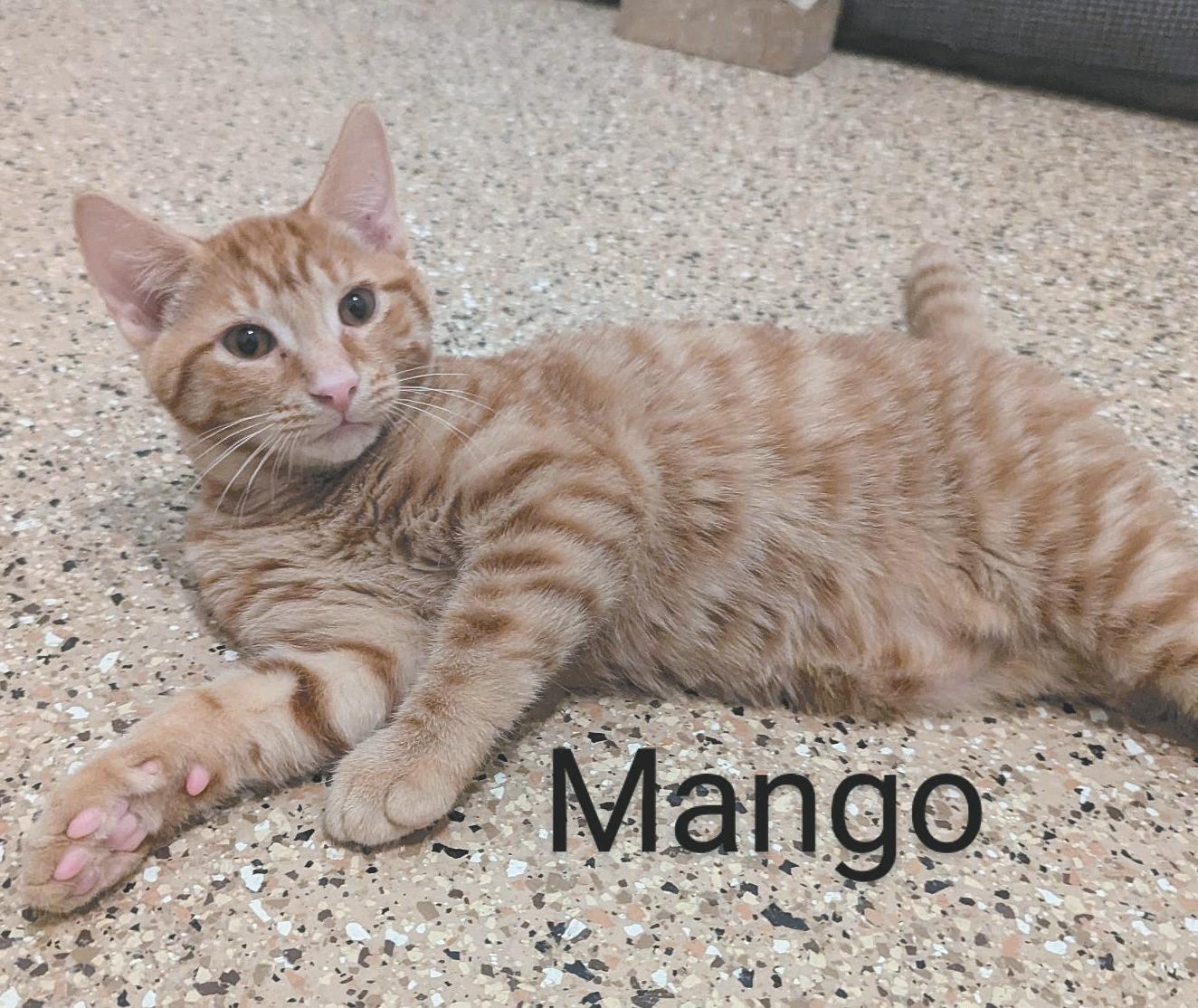 Mango is a 4-month-old male orange-striped tabby kitten. He is full of fun and loves running and playing with siblings. He has beautiful markings with leopard spots on his stomach.