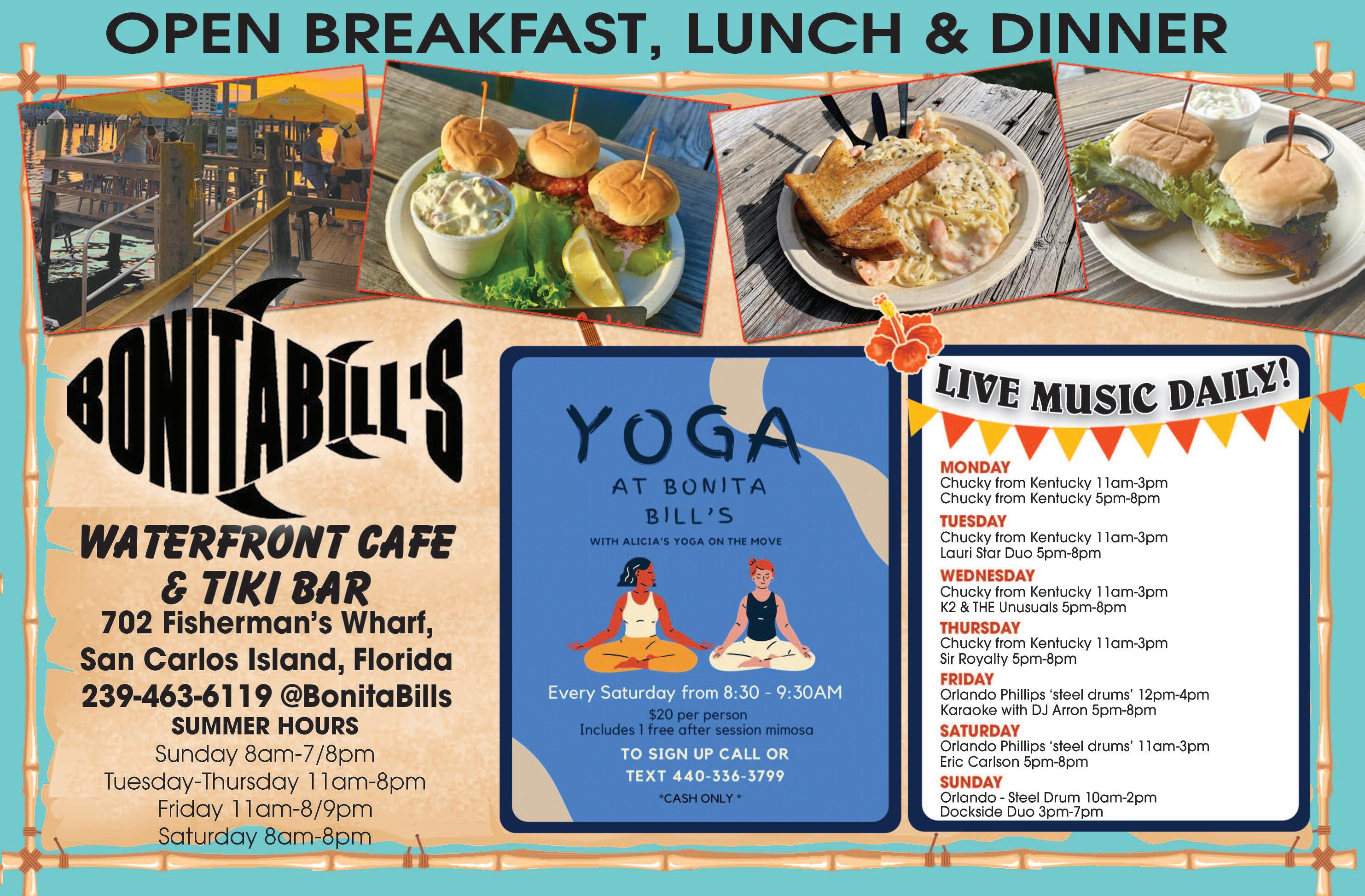 Doc Ford’s and Dixie Fish Company, on Fishermans Wharf, are open daily from 11 a m to 10 p m and have been the recipients of numerous awards