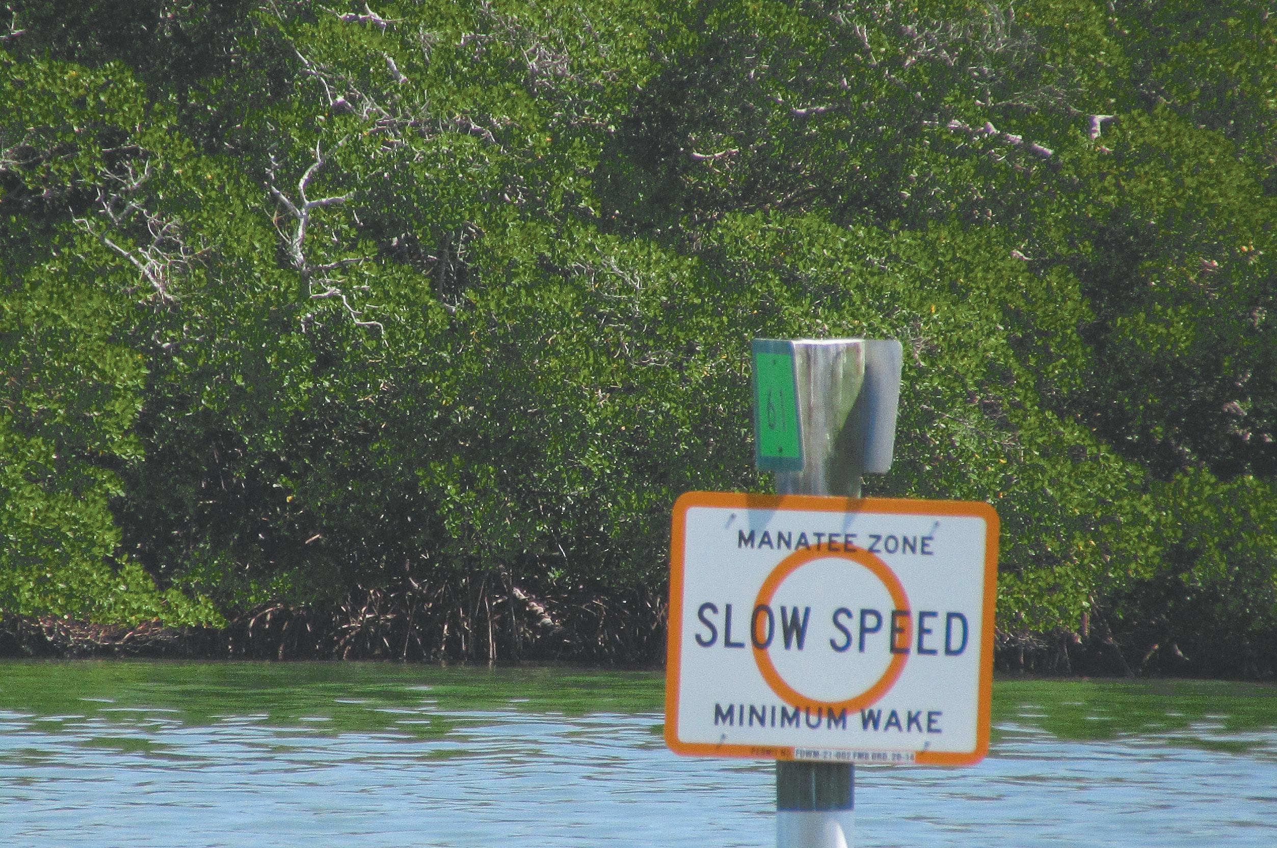 In an area in the bay of Fort Myers Beach between Matanzas Pass and Pelican Bay where there are signs reminding boats of the slow speed manatee zones that the Town of Fort Myers Beach instituted, Howell said boaters