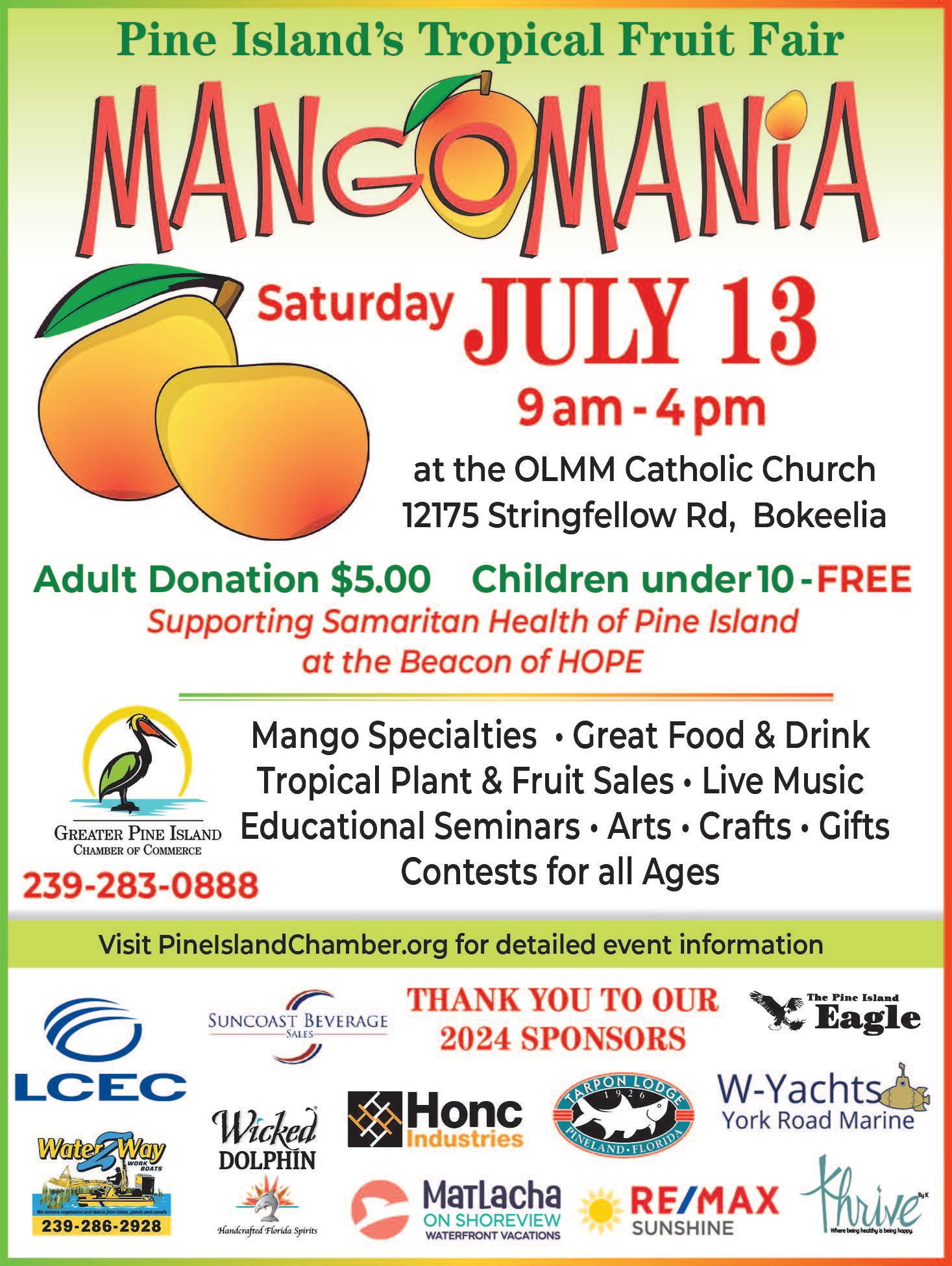 The Greater Pine Island Chamber of Commerce is gearing up for MangoMania 2024, Pine Island's tropical fruit fair, which will be held this Saturday, July 13, at Our Lady of Miraculous Medal Church from noon to 4 p m