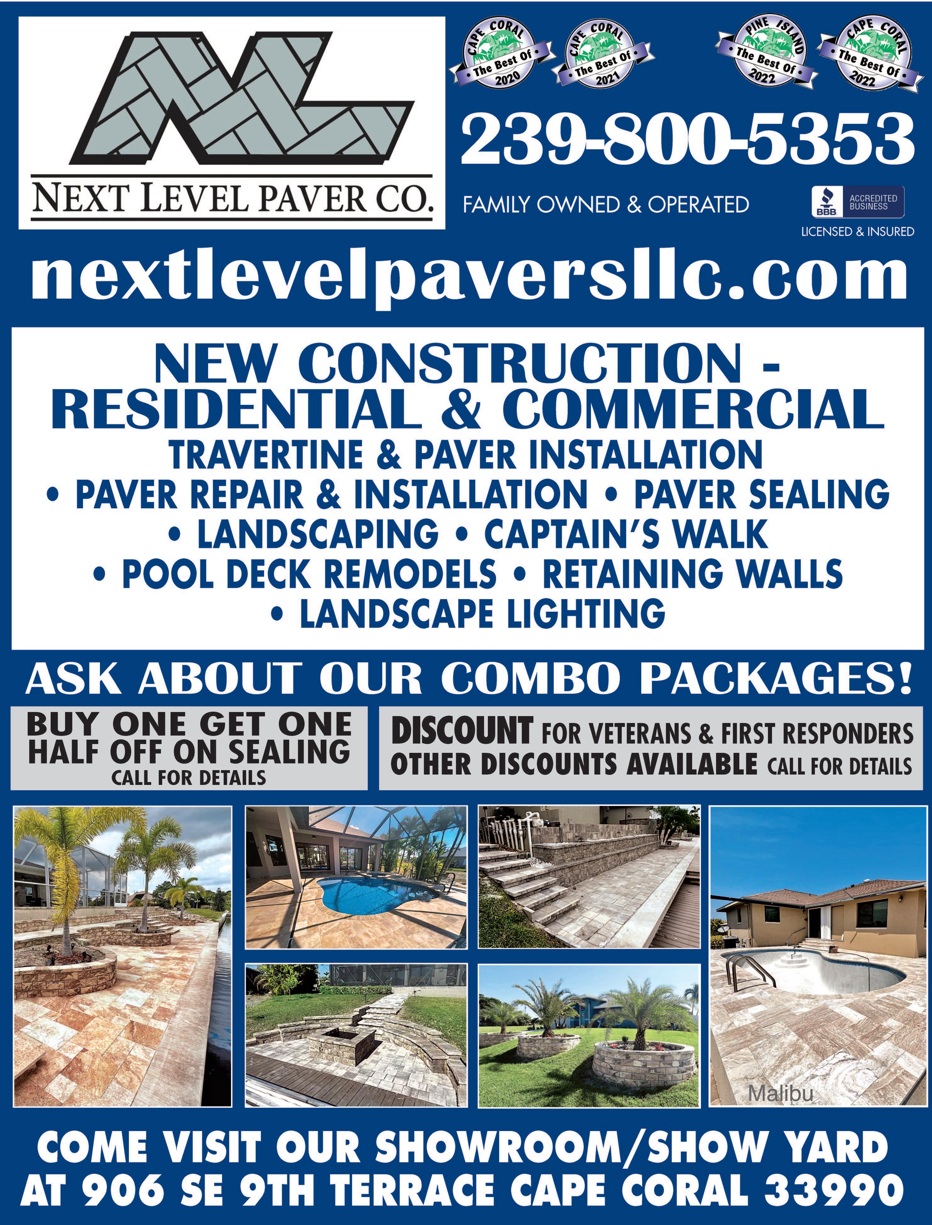 A+RATED-ANGIESLIST Installation&Repair Licensed&Insured FAMILYOWNEDSINCE1981 LEE#LSO200031 CAPE#06938 Sanibel#S11-000923 Residential/Commercia l FullServiceGeneralContractor *Additions *Remodels *Renovations 30YearsExperience VeteranOwned 239-560-5448 bestorcontracting.com Licensed&Insured License#CGC1532266 ONEMANPAINTINGCO. Residential Interior&Exterior DetailOriented, TidyandPersonal Nojobtoosmallorlarge utilizingathreepersoncrew. Andalways,freeestimates andreferencesfurnished. Givemeacalltodiscussallof yourpaintingneeds. ThankYouInAdvance Steve (239) 339-7361 AFFORDABLE FREE ESTIMATES NewInstallation IncludesPermit 2YearWarranty RainBirdContractor A+RATED-ANGIESLIST Installation&Repair Licensed&Insured FAMILYOWNEDSINCE1981 LEE#LSO200031 CAPE#06938 Sanibel#S11-000923 UltraPlumbing &DrainCleaning,Inc PlumbingInstallations ServiceandRepair 24/7EmergencyServices DrainBack-Ups PipeBursts Residential&Commercial Honest-Professional Affordable Veteran&SeniorDiscounts FreeEstimates 239-203-7047 FacebookandInstagram @ultraplumbingservice Licensed&InsuredLic#CFC1430549