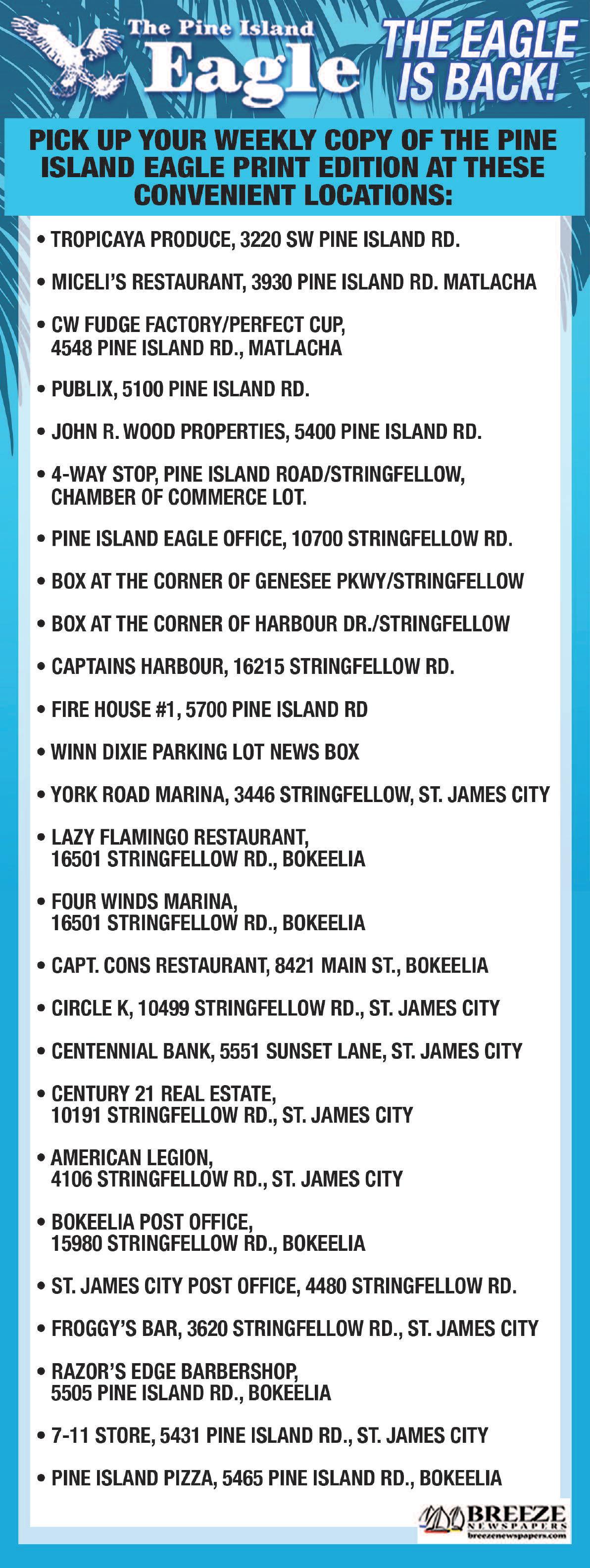 27: in Matlacha -- the Post Office, The Perfect Cup, Blue Dog Restaurant, Trader’s Hitching Post, CW Fudge Factory, Yucatan Waterfront and Miceli’s Restaurant; at the Center -- Ace Hardware, Pine Island First Baptist Church and Pine Island United Methodist Church; in Bokeelia -- Salty Girls Island Cafe, Spots Ice Cream and Crepes, the Pine Island Library, Our Lady of the Miraculous Medal Catholic Church and the Bokeelia Post Office; in St James City -- Moose Lodge, Winn-Dixie, Centennial Bank, Fishers of Men Lutheran Church, Pine Island Community Church, Pine Island Auto Care and First Baptist Church of St James City