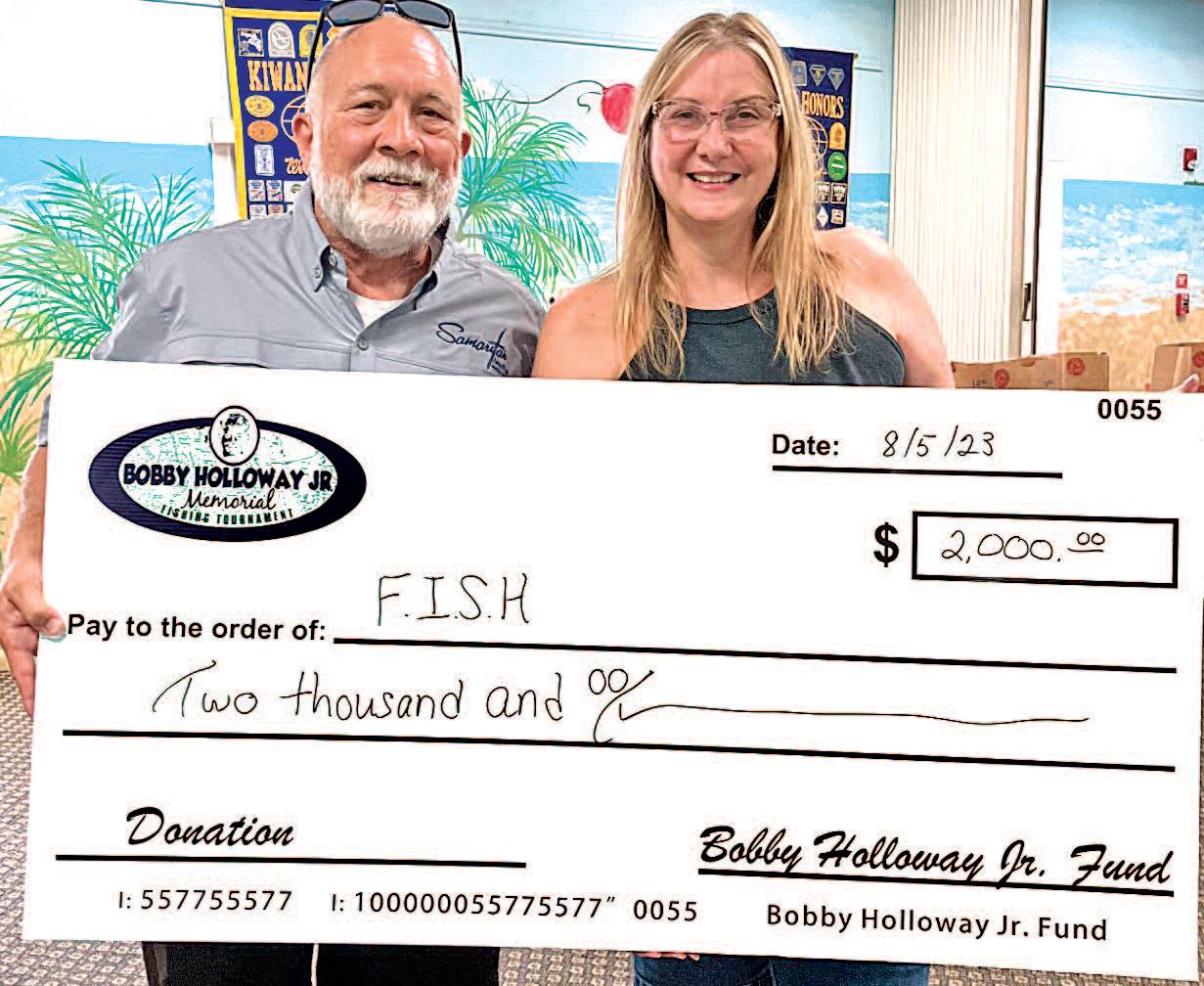 PHOTO PROVIDED BY DARCY CONNER Steven Hook. left, and Darcy Conner, the F.I.S.H. Basket Brigade chair, with a $2,000 donation from the Bobby Holloway Jr. Foundation.
