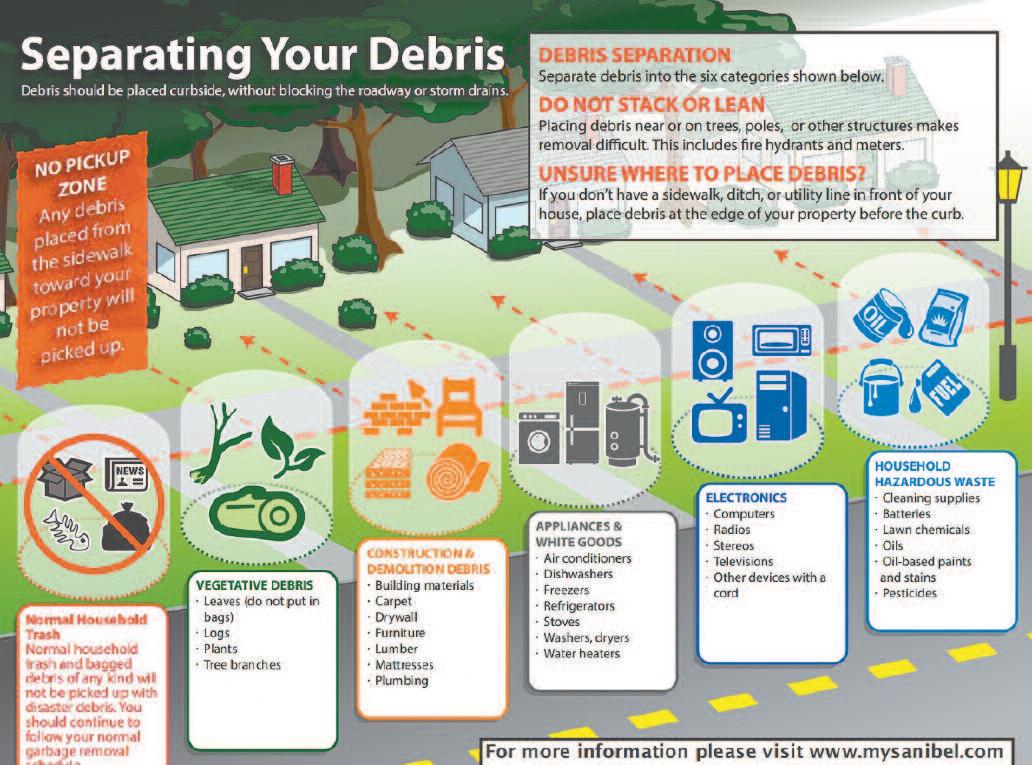 Sanibel residents, who can safely do so, are asked to place any storm-generated debris on the public right-ofway The public right-of-way is the area of residential property that extends from the street to the sidewalk, ditch, utility pole or easement