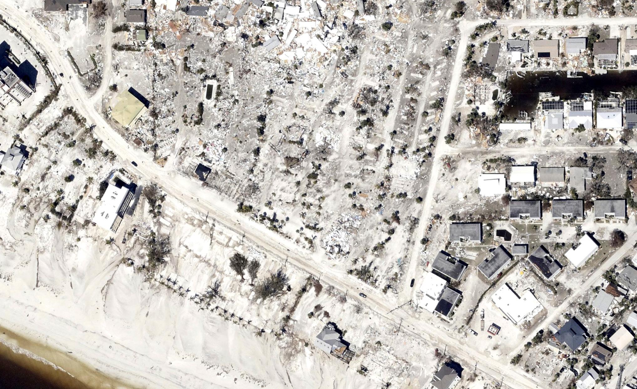 This satellite map provided by NOAA shows damage from Hurricane Ian to Red Coconut RV Resort in Fort Myers Beach, Florida, on Saturday.