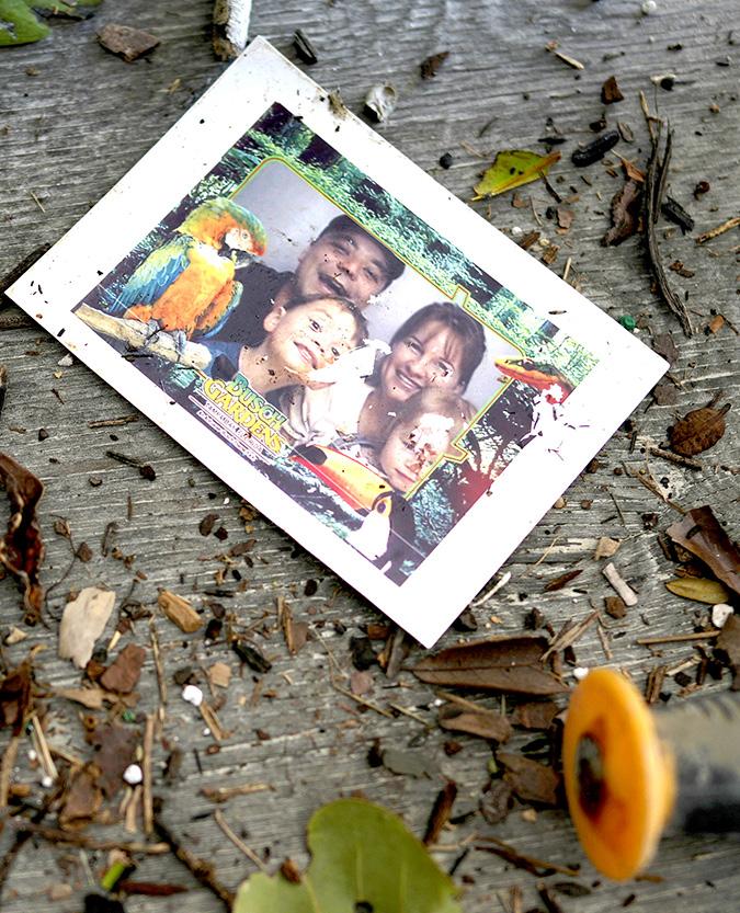A photograph of an unknown family found by the Hudson family of Canada at their vacation home after the passage of Hurricane Ian rests alongside tools recovered from their storm-surge damaged garage level, near San Carlos Boulevard in Fort Myers Beach, Florida.