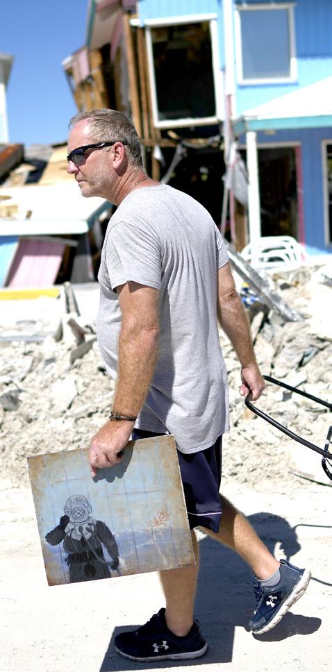 John Quigley carries a piece of artwork made by his daughter, the only thing he found to sal vage from his collapsed home, as he pulls his girlfriend’s son Sebastian in a cart while walk ing off the island, two days after the passage of Hurricane Ian, in Fort Myers Beach, Florida.