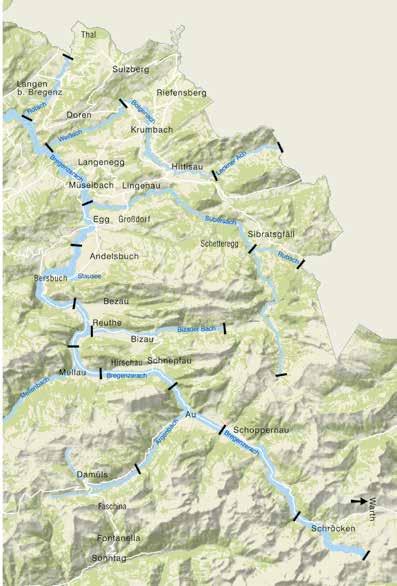 Immer geht es hinüber und – von Norden und Westen am eindrucksvollsten – schließt sich dann ein Raum auf, der – in sich vielgestaltig – nach außen deutlich geschieden ist mit der Bregenzerache als verbindendes Band. Ihrem Lauf folgend wechseln sich Talengen und flache Senken –weit zwischen den Hügeln des Voralpenlandes um Alberschwende und Lingenau, enger zwischen den Bergen der Voralpen um Andelsbuch und Bezau, eingezwängt zwischen den hochalpinen Gipfeln von Kanisfluh, Diedamskopf, Zitterklapfen und Widderstein um Schnepfau, Au, Schoppernau, Warth und Schröcken. Dies entspricht der Gliederung in