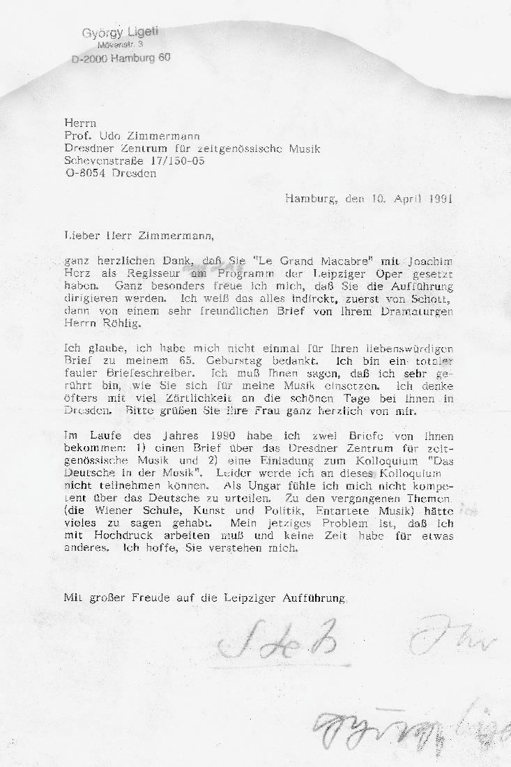 Ich danke allen beteiligten Autoren, die es auf sich genommen haben, ihre Erinnerungen an teils viele Jahrzehnte zurückliegende Begegnungen, Erlebnisse oder Arbeitsprozesse mit Udo Zimmermann wachzurufen und aufzuschreiben. Es sind wunderbare Texte entstanden, fein gezeichnete Porträts, sehr persönliche Einblicke in seine Arbeitsweise als Komponist und als Intendant, in sein Ringen um Kompositionen, in seine Gedankenwelt. Nicht alle, deren Erinnerungen wertvoll gewesen wären, ließen sich noch befragen. Wie gern hätte ich Harry Kupfer zu seinen Dresdner Uraufführungs-Inszenierungen von Levins Mühle und Der Schuhu und die fliegende Prinzessin befragt oder Kurt Horres zu seinen zahlreichen Zimmermann-Inszenierungen der 1980-er Jahre in Westdeutschland! Was hätten Komponistenfreunde wie Karlheinz Stockhausen, Mauricio Kagel, György Ligeti und Dieter Schnebel von Begegnungen und Aufführungen berichten können! Wie hätte Max Frisch rückblickend die Gespräche über eine Veroperung seines Gantenbein erinnert, George Tabori die gemeinsamen Probenwochen in Salzburg und Leipzig oder die Dirigenten Stefan Soltesz, Gary Bertini und Michail Jurowski ihre Arbeit mit Udo Zimmermanns Werken? Einen kleinen Eindruck von diesen und anderen Begegnungen und Freundschaften vermitteln Briefe, Fotos und Dokumente aus dem Nachlass. Der Abdruck der Briefe erfolgt mit freundlicher Genehmigung ihrer Schreiber oder deren