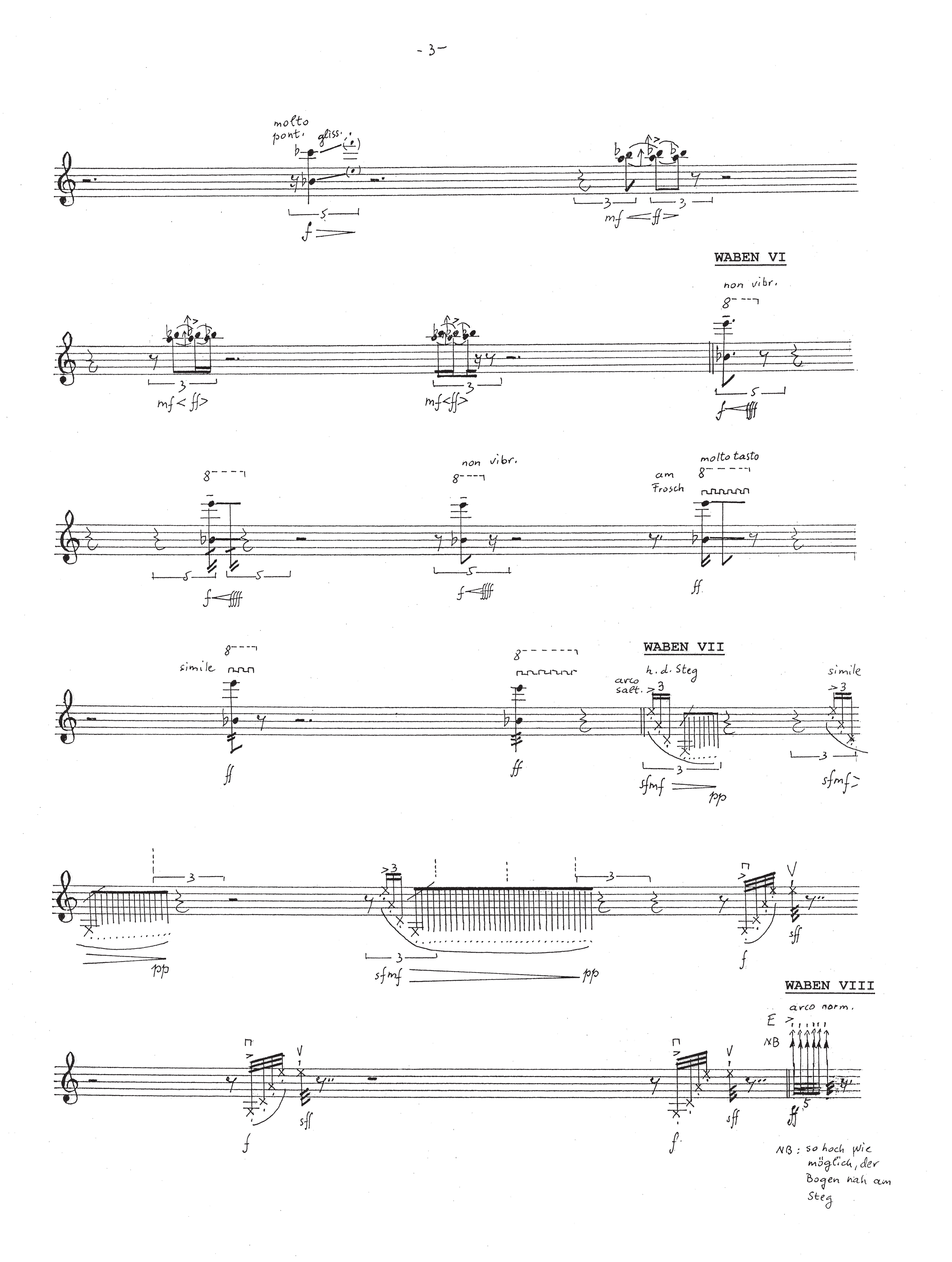 „Anlaß dieser Komposition war meine Auseinandersetzung mit einer wissenschaftlichen Studie über die Signale von Bienen. Es war faszinierend, daß diese Signale auf einer fein abgestuften Mikroperiodizität beruhen. Es gibt im Werk 15 Etappen, die als ,Waben‘ bezeichnet sind. Jede Wabe behandelt ca. sechs gleiche Ereignisse, die identische Dynamik und fast gleiche Spielart, Klangfarbe und Tonhöhen aufweisen, aber niemals zeitlich exakt periodisch eintreten.“