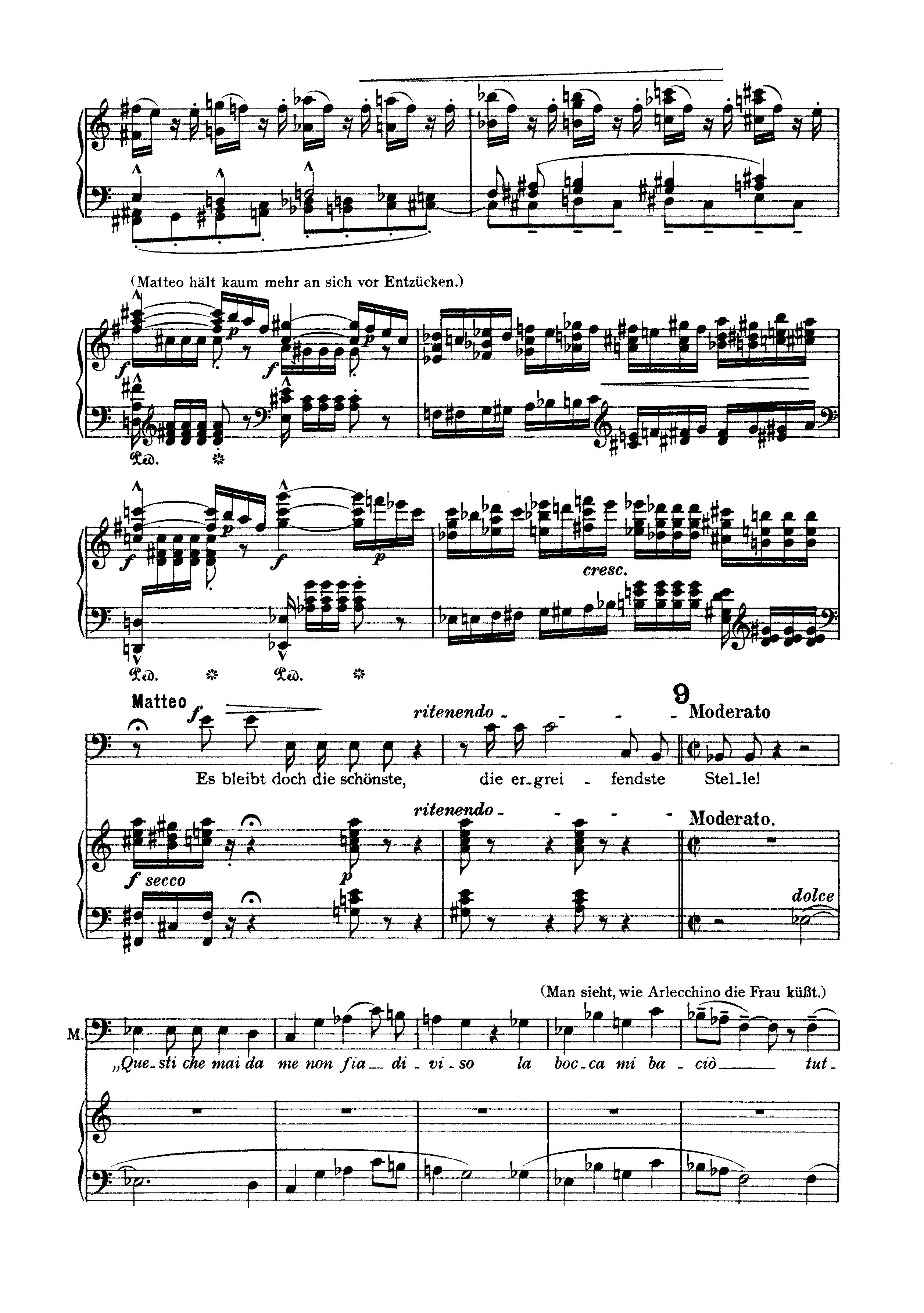 Inspirierendes Moment für diese Akzentuierung, könnte Pierrot Lunaire gewesen sein, uraufgeführt im Oktober 1912 in Berlin Am 17 Juni des folgenden Jahres lädt Busoni Arnold Schönberg und seine Truppe mit der graziösen Novität in seine große Wohnung am Viktoria-Louise-Platz Von dem generösen Privatkonzert mit zahlreichen auch prominenten Gästen zeugt ein ausführlicher Brief des Gastgebers an Egon Petri; das Schreiben belegt, welchen Eindruck das Stück in Busoni hinterlässt Für Antony Beaumont ist Schönbergs Pierrot Lunaire eine Art „Katalysator“ auf der Suche nach Arlecchino, 5 zum einen weil dieser mondsüchtige Pierrot ein naher Verwandter des italienischen Harlekin ist, zum anderen, wegen der besonderen Behandlung der Sprechstimme, die hier nicht nur rhythmisch notiert ist; die ebenfalls angegebenen Tonhöhen sind sprechend anzudeuten, in wenigen Augenblicken darf/muss gesungen werden Die so entstehende Vokallinie verleiht dem Text eine fluidale, abgründige, nicht zuletzt manierierte Präsenz, die, unterstützt durch eine kristalline Kammermusik, idealtypisch zu den „dreimal sieben Gedichten“ nach Albert Giraud passt Ein Anstoß gewiss, eine Herausforderung, – das „Theatralische Cappriccio“ nimmt einen eigenen Weg, nicht nur weil Busoni eine etwas unangestrengtere Form des Melodrams wählt Trotz aller Italianità – Arlecchino klinkt sich listig in die Entwicklungslinie des (deutschen) Singspiels ein, das in dieser extravaganten Form mit einer ganzen Palette von Vokaläußerungen aufwartet, insbesondere, was das Sprechen des Titelhelden angeht, also mit und ohne Orchesterbegleitung rhythmisch notiert oder einfach nur gesprochen, etwa in dem programmatischen Prolog Die Dialoge sind von einer schlagfertigen Knappheit, gelegentlich darf/muss auch Arlecchino singen Das virtuose „La, la, la“ von 23 Takten, mit dem er sich nach dem ersten (szenischen) Auftritt davonmacht, ist allerdings von einem Schauspieler schwer zu bewältigen, der Schlusston dieser Jubelei, das hohe A, ist drei Takte lang zu halten In den meisten Fällen macht das wohl der Tenor, der als Leandro erst später gebraucht wird Das sind Theatertricks Busoni verlegt den effektvollen Abgang für alle Fälle hinter die Szene, im Rondo Arlecchinesco hatte er die Vokalise bereits als Überraschung eingebaut: „Una voce di Tenore“, fast identisch mit der späteren Theaterversion Von Anfang an denkt er für die Besetzung der Titelpartie im Übrigen an Alexander Moissi, einen Superstar der Reinhardt-Bühnen Der spielte 1911 in der TurandotInszenierung im Deutschen Theater Berlin mit Busonis Musik den Kalaf Moissi war berühmt für einen kurvigen Vortragsstil, seinem durchaus umstrittenes Markenzeichen Klabund preist