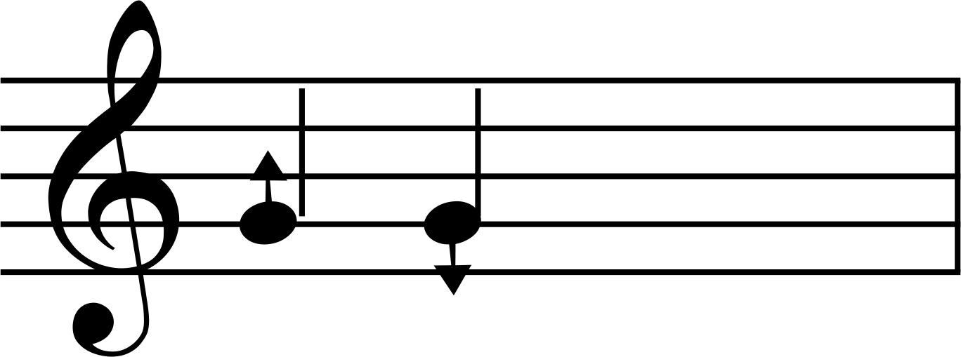 Mikrotonale Abweichung einer Tonhöhe. Sie wird an der betreffenden Stelle erörtert. Bei Holzbläsern: Mit einer bestimmten (bezeichneten) Griffkombination verbundene Tonhöhe, welche von Instrument zu Instrument leicht variieren kann. Bei Blechbläsern: natürlich „unsauberer“ Oberton | Microtonal deviation from a pitch. Every passage will be discussed in detail. For woodwind instruments: The pitch is connected with a definite (illustrated) fingering combination. The pitches can vary slightly from instrument to instrument. For the brass: naturally “unclear” pitch of an overtone series.