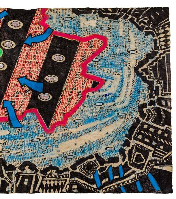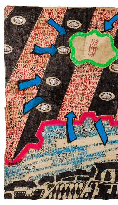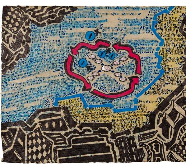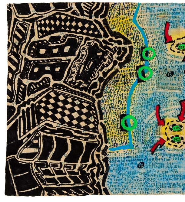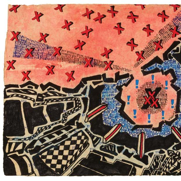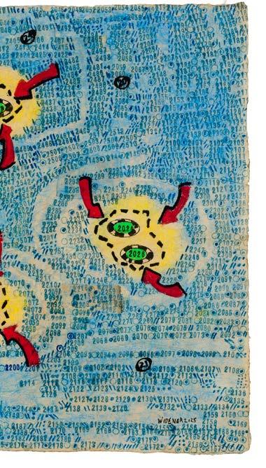 The numbers stamped across the composition are found throughout Widener’s oeuvre. On one level, they are an intuitive attempt by a numbers savant to find order in the chaos seen firsthand. He uses numbers to reveal the existence of recurring patterns in the universe, predictable truths that underlie even the most inexplicable of human follies. Looking closely, the sequences of numbers go forward into the future suggesting the ripple effect trauma can have on families and communities. On another level, counting numbers is an effective coping mechanism for an autistic artist with PTSD under tremendous stress. It is an intensely personal response to an extraordinary moment in human history.