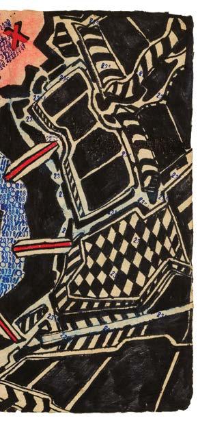 personal mission is to support local communities and document the ongoing challenges faced by the Ukrainian people. This commitment to both global awareness and the fight for democracy permeates Widener's art, imbuing it with a sense of empathy and urgency. A veteran of the U.S. Air Force during NATO’s Cold War era, Widener grapples with long-diagnosed post-traumatic stress disorder, or PTSD. Over decades, he has struggled to adjust to civilian life and, instead, has chosen a comparatively unrooted existence. Widener’s resulting peregrinations are a recurring theme in his work. Many of Widener’s drawings form a travel log of his experiences around the world, especially in Europe. The drawings are map-like in appearance and dense with information.