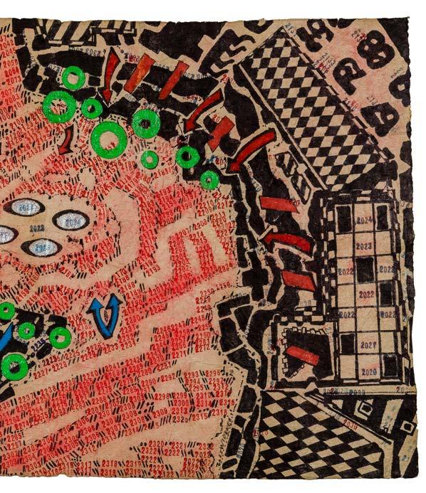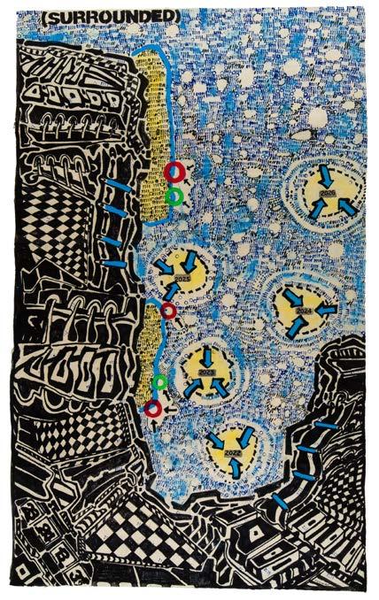 The works in The Heart of War take visual cues from heavily relied-upon maps of the Ukraine-Russia conflict compiled by the Institute for the Study of War in Washington, D.C., an open-source intelligence and analytics organization whose up-to-date interactive maps are used widely by combatants and non-combatants alike. They are considered highly accurate reporting of the ever-fluctuating frontline and of troop movements in certain ongoing battles. These detailed geographic maps are overlayed with colors and lines denoting captured territory and enemy incursions. A series of symbols and crosshatches indicate the current status of a given area. Circles pinpoint the heaviest fighting in a 24-hour period.