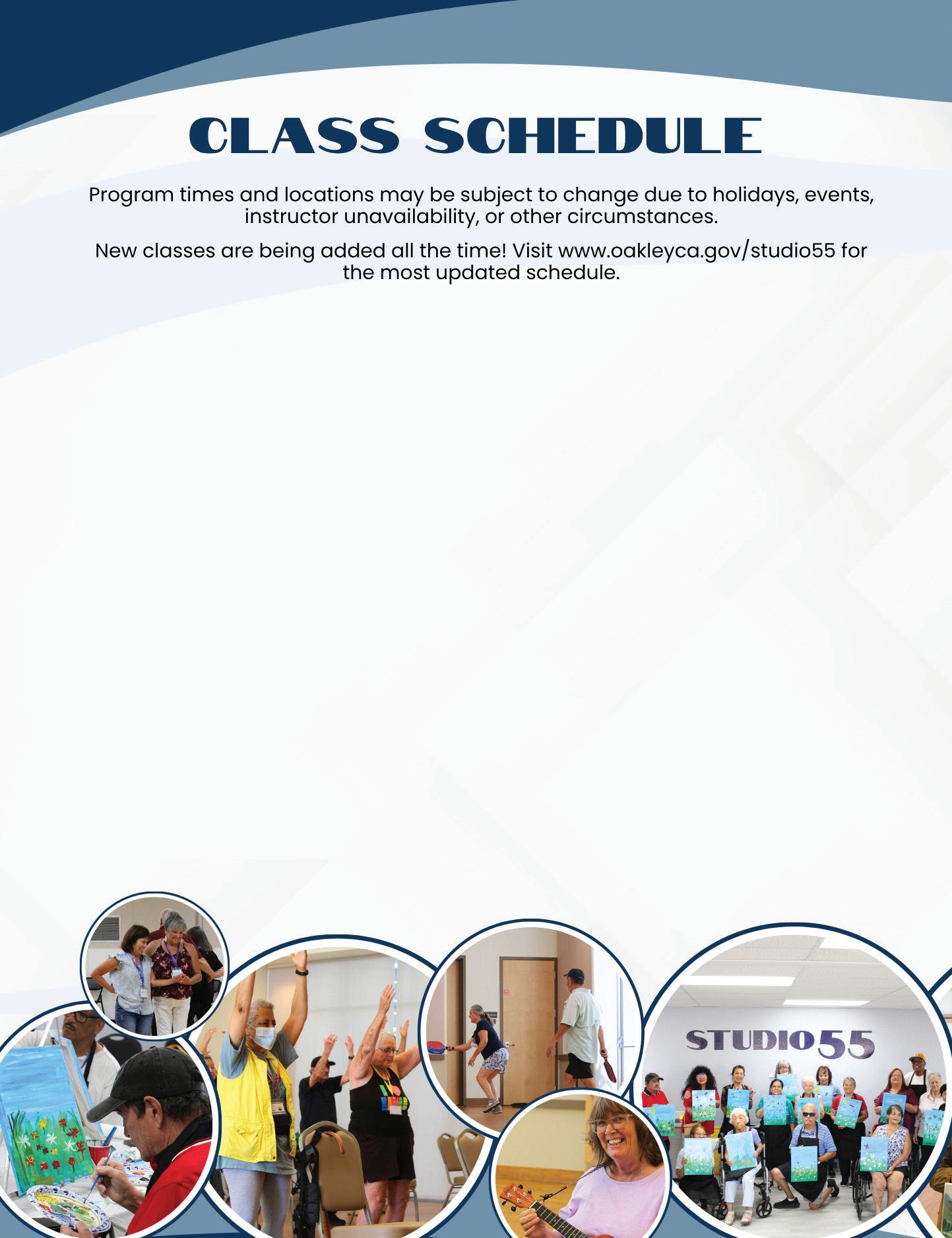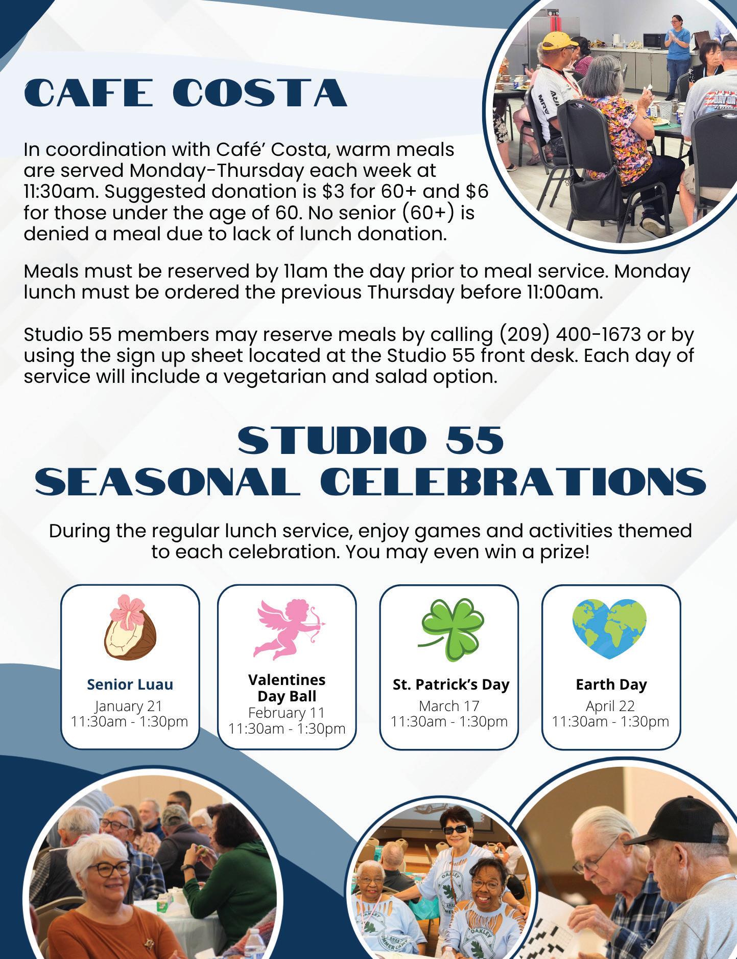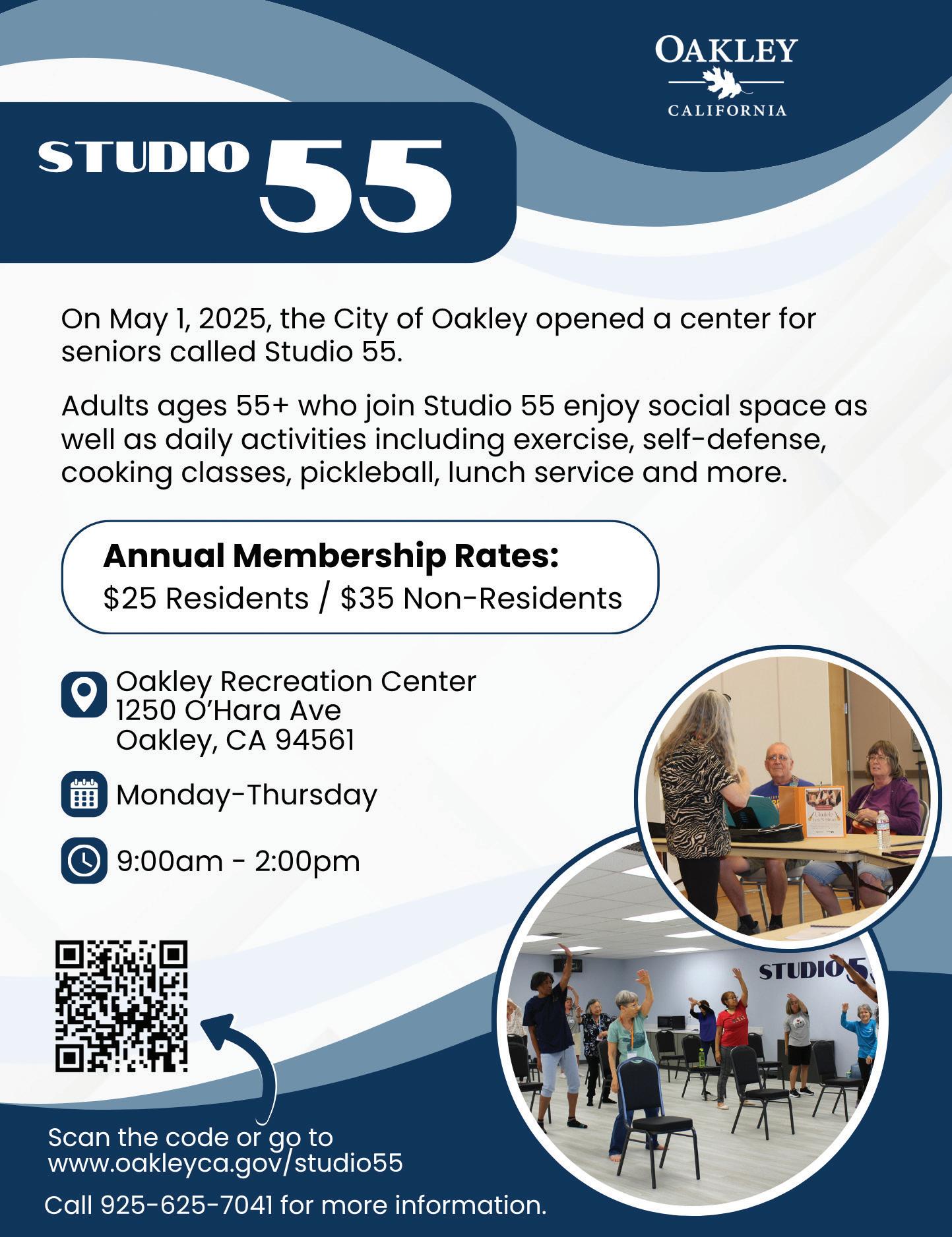 Studio 55 is the City of Oakley’s new senior center for the 55+ population . Studio 55 is located at 1250 O’Hara Avenue and is open Monday-Thursday from 9am-2pm Each day features enrichment classes, programs and lunch service One day per month is dedicated to a “Seasonal Celebration” These celebrations typically consist of a special lunch menu, themed activities and games such as bingo, trivia, crafts and more Seasonal Celebration events are free to Studio 55 members .