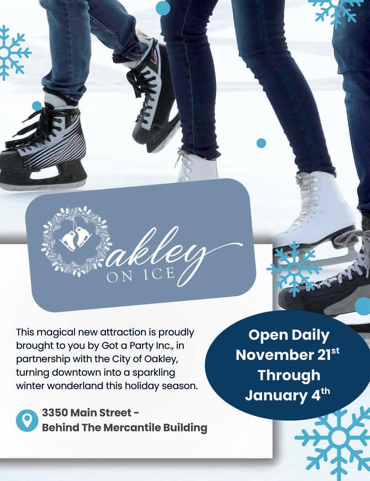 The City of Oakley is thrilled to announce the launch of Oakley on Ice, a brand-new seasonal ice-skating experience coming to Downtown Oakley this holiday season! The rink is open through January 4, 2026, located in the parking lot directly behind the Mercantile Building at 3350 Main Street .