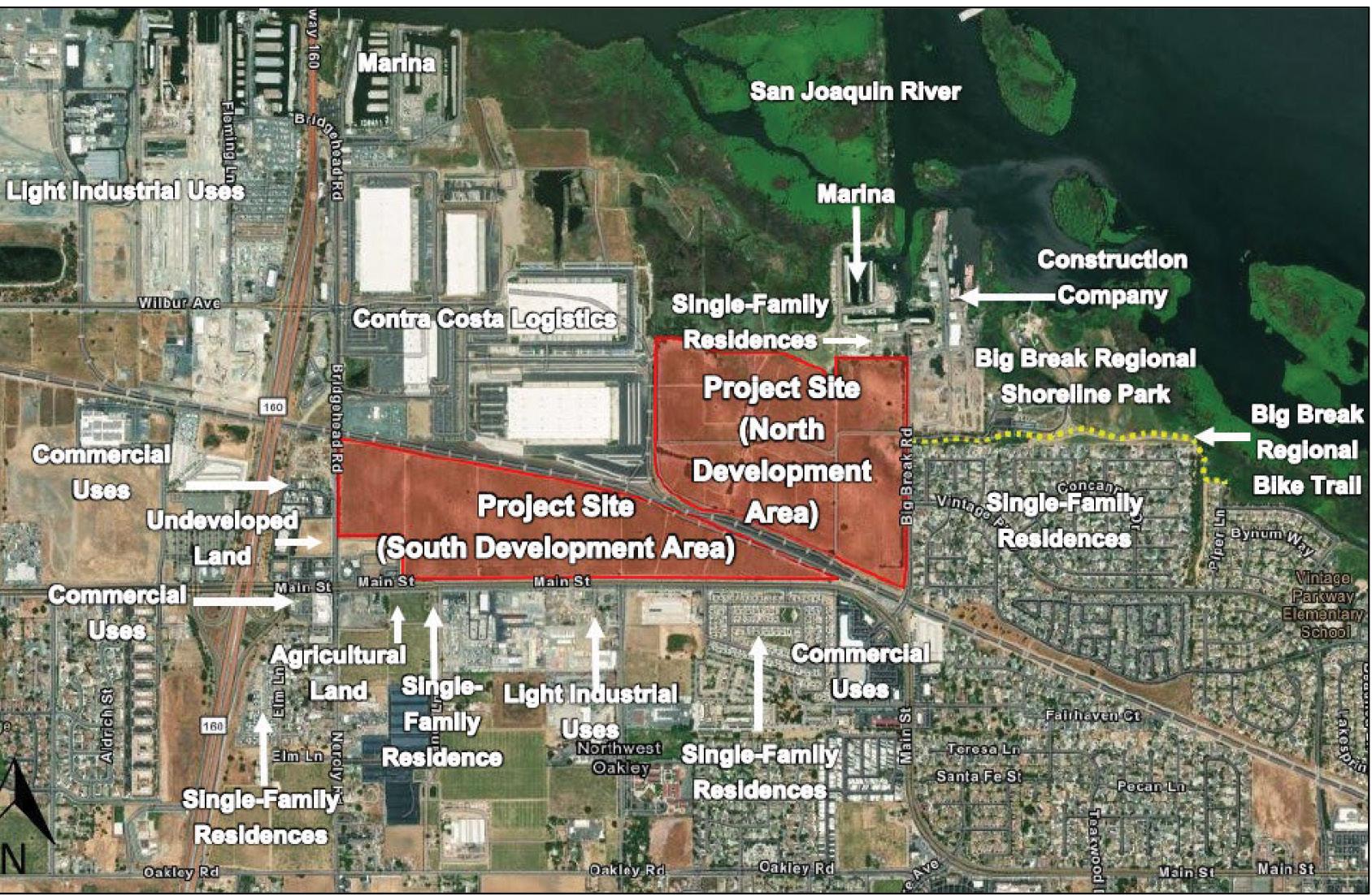 tery storage. To the north of the property is the Big Break Marina, to the east are the Big Break Regional Shoreline and family homes, to the south are more homes across Main Street, and to the west are Bridgehead Road and the Oakley Logistics Center. The industrial park will have 10 buildings, ranging in size from 117,180 to 936,680 square feet to attract a diverse set of “top-tier tenants,” from local businesses to Fortune 100 companies, according to Jason Bennett of developer Jb2 Partners. The construction process is expected to take six to 10 years, with the southern portion’s buildings being constructed first.