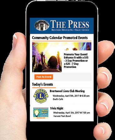 For print, email your events to calendar@brentwoodpress.com one week prior to publication. For online, post your events for free on The Press Community Calendar www.thepress.net/calendar.