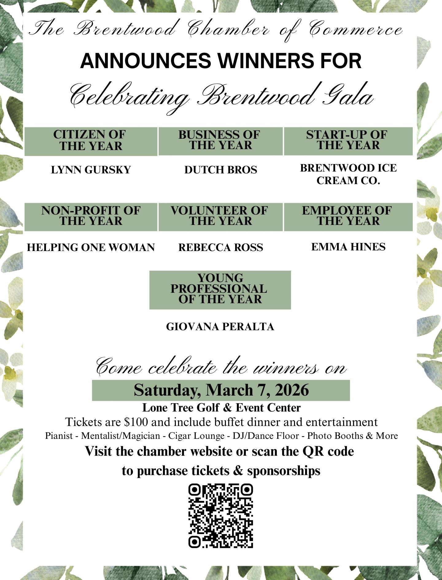 The Brentwood Chamber of Commerce announced the winners of the awards to be presented at the gala on March 7. The winners are: