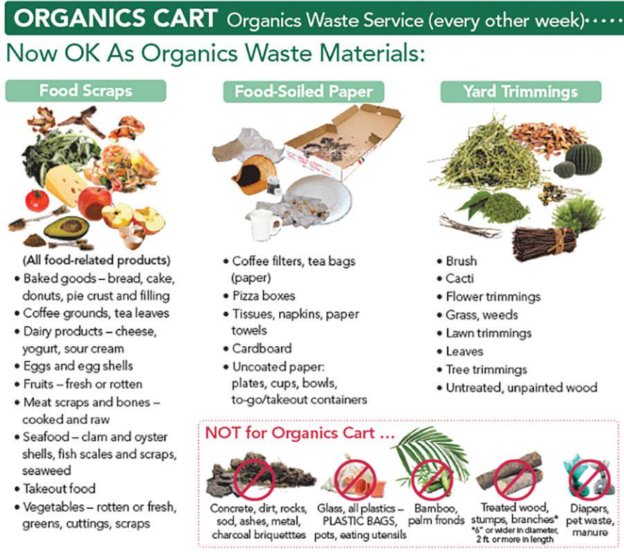 “Just because an item is in your yard or garden, that does not mean that it can go in your green bin,” Yepsen said. “For instance, palm branches likely need specific processing to break down properly, and other items — like treated or painted wood, food-soiled paper that hasn’t been certified as compostable, may have contaminants that introduce harmful substances into the compost.”
