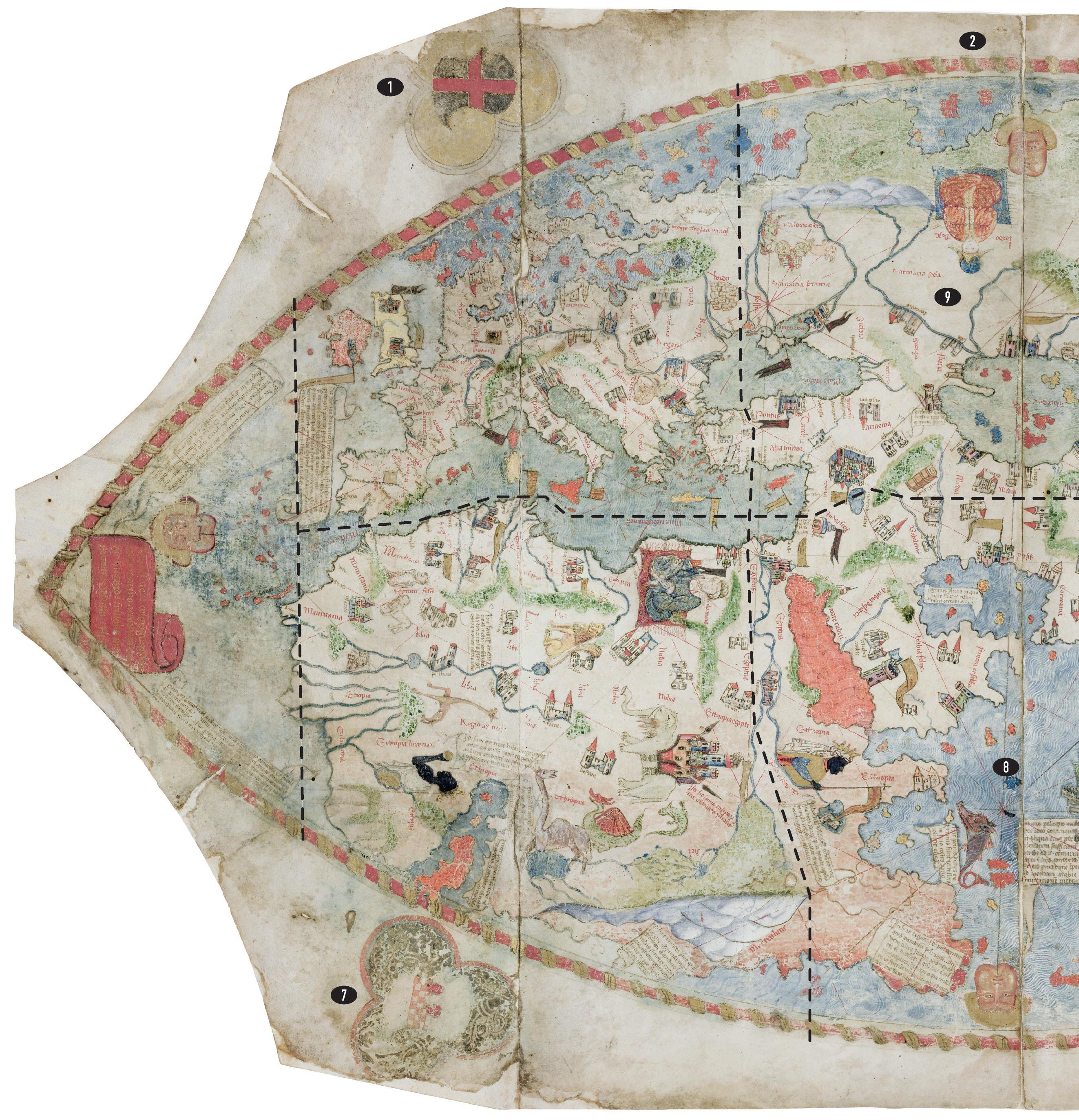 Die Kartenmachenden vermittelten also, dass der durch die Kraft des Mondes bewegte Ozean die gesamte Erde bedeckte, stellten aber auf der Karte nur denjenigen Teil der Erde dar, der aus dem Ozean herausragte. Nach diesem Schriftband und der Gesamtheit des Kartenbilds zu urteilen, stellten sich die Kartenmachenden den überwiegenden Teil der kugelförmigen Erde bedeckt vor von einem immensen, dem Tagesrhythmus des Mondes unterworfenen Ozean (10), unterbrochen von nur einer einzigen zusammenhängenden Landmasse (9). Diese umgaben