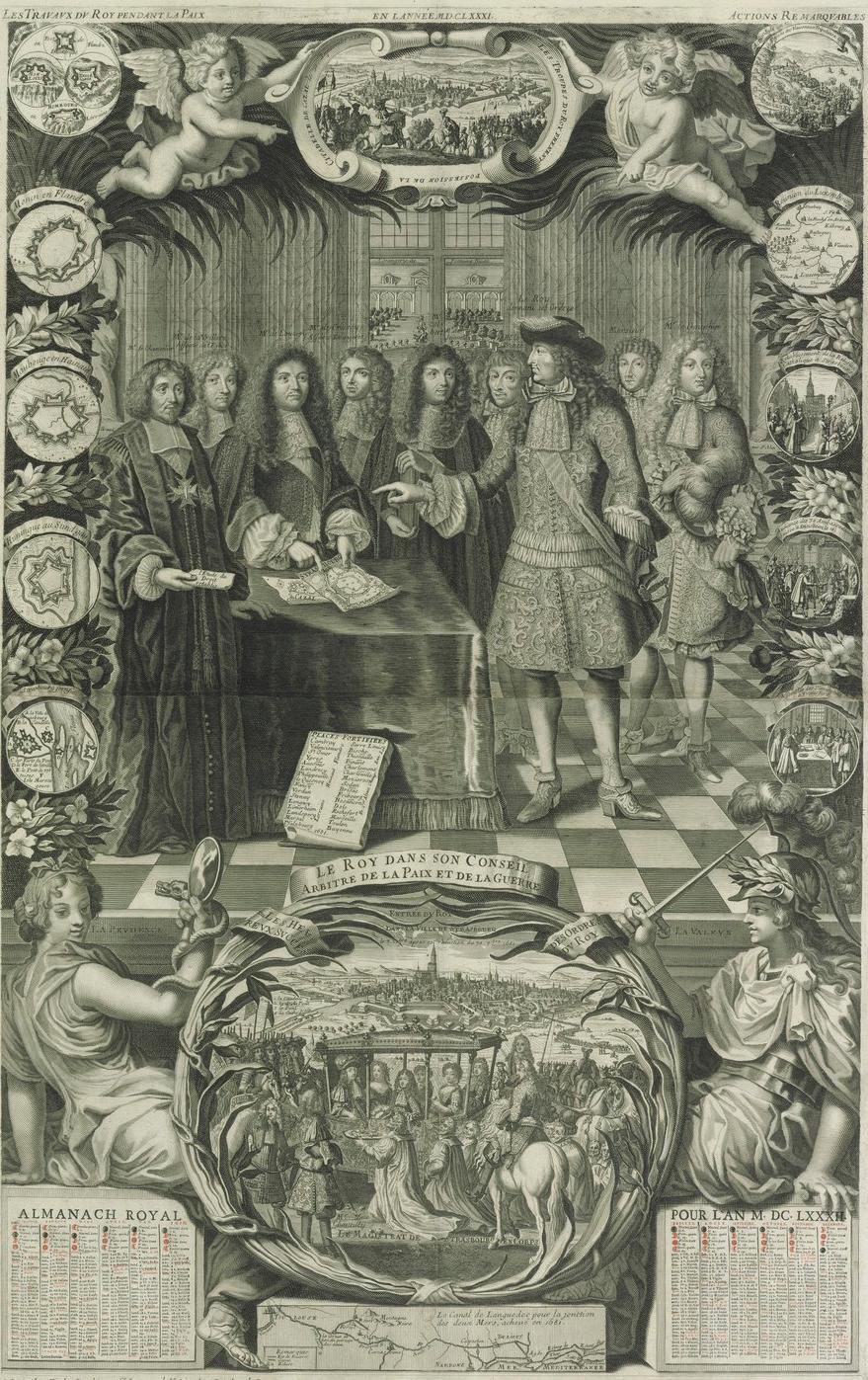 Turning to seventeenth-century figurative depictions of Marseille, we see how the image ends up being slightly different, even if the principal ingredients are similar to those of the written sources. A preliminary investigation has revealed that maps and views show not so much the port element but rather that of the city’s security and safety, guaranteed by the expansion and fortification works undertaken at the behest of Louis XIV.29 The fortifications of Marseille are celebrated together with other achievements and triumphs of the sovereign in a 1681 print by Henri Noblin (Fig. 9.1), which shows the