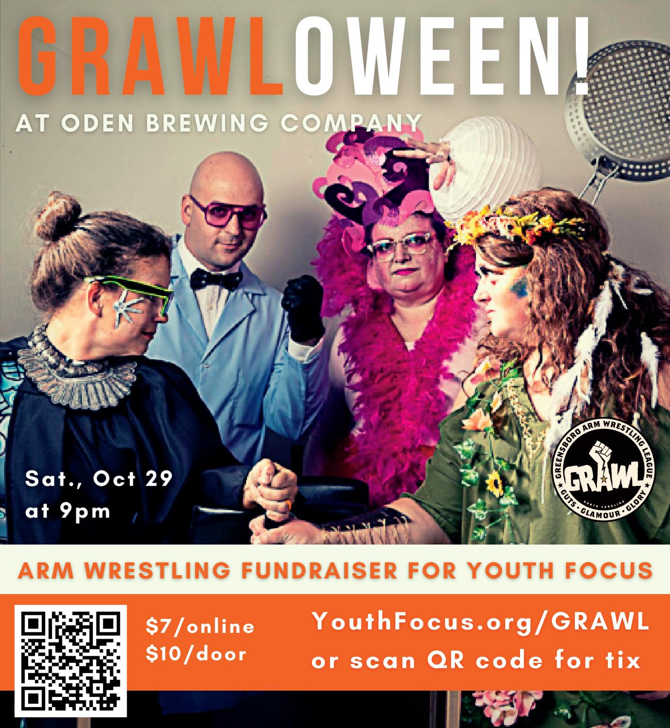 The Greensboro Arm Wrestling League is hosting a Halloween-themed arm-wrestling competition and benefit for the nonprofit Youth Focus. Watch as Smother Earth, the Fairy Bod Mother, Kraken Skullz and Father Figure take on Ruth Bader Ginsborg, Toy Soldier, Amazon Prime and K9, wrestling on behalf of Youth Focus. Find more information and reserve your space at youthfocus.org/grawl.