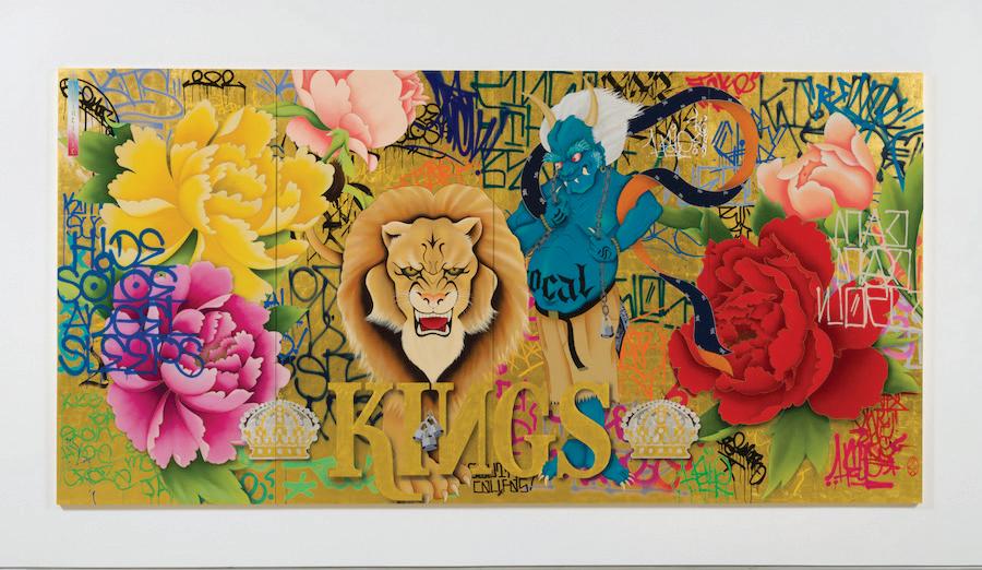 Gajin Fujita, ‘Invincible Kings of This Mad Mad World,’ 2017A monthly glimpse at the works in the current exhibition Gilded: Contemporary Artists Explore Value and Worth. On view at the Weatherspoon Art Museum at UNCG through April 8. in this painting from 2017, Fujita includes the image of a lion — king of the jungle — plus two ornate crowns and the word KINGS lifted from the logo of the city’s professional hockey team.