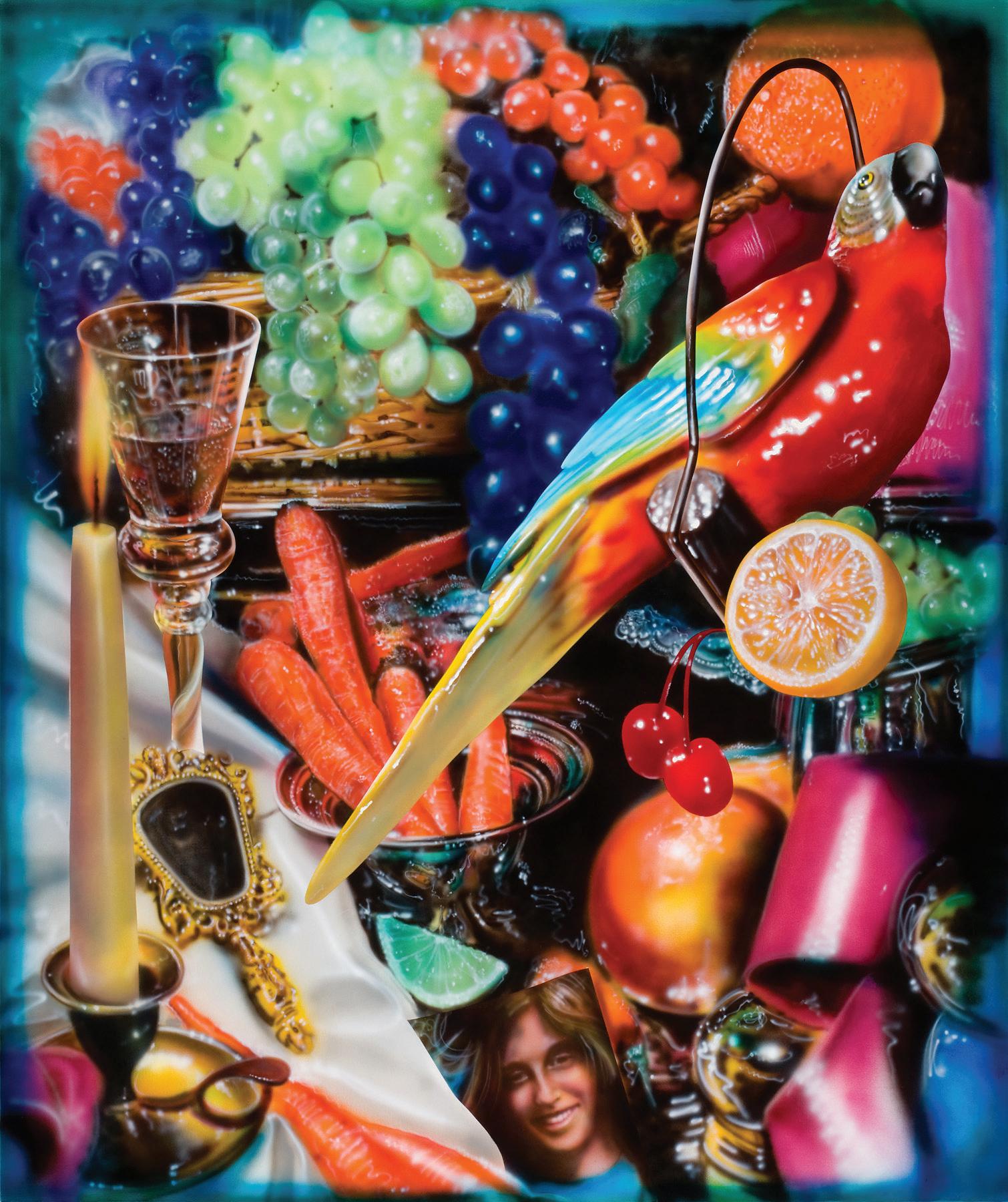 The painting’s opulent gold-leafed surface under scores these notions of personal grandeur. Fujita has shared that he was thinking about the gilded walls of a receiving room at Nijo Castle in Kyoto, the 17th Century home of the Japanese emperor’s military leader, and a space designed to demonstrate power. Fujita has re-created Fujin, the revered god of wind, with his vibrantly hued skin, wild hair, and billowing sash, but instead of depicting him in the sky, he has brought him to earth and surrounded him with oversized peonies and a lion on a chain. This abundance of natural ele ments — wind, flora, and fauna — speaks to the artist’s concern for the environment, and his frustration with the human hubris that disregards it: “I painted this work in hopes that it would send a clear message that nature rules over all of us on this planet.” That we so often fail to honor it makes our current culture, as the artist notes in the second half of his title, a “mad, mad world.”