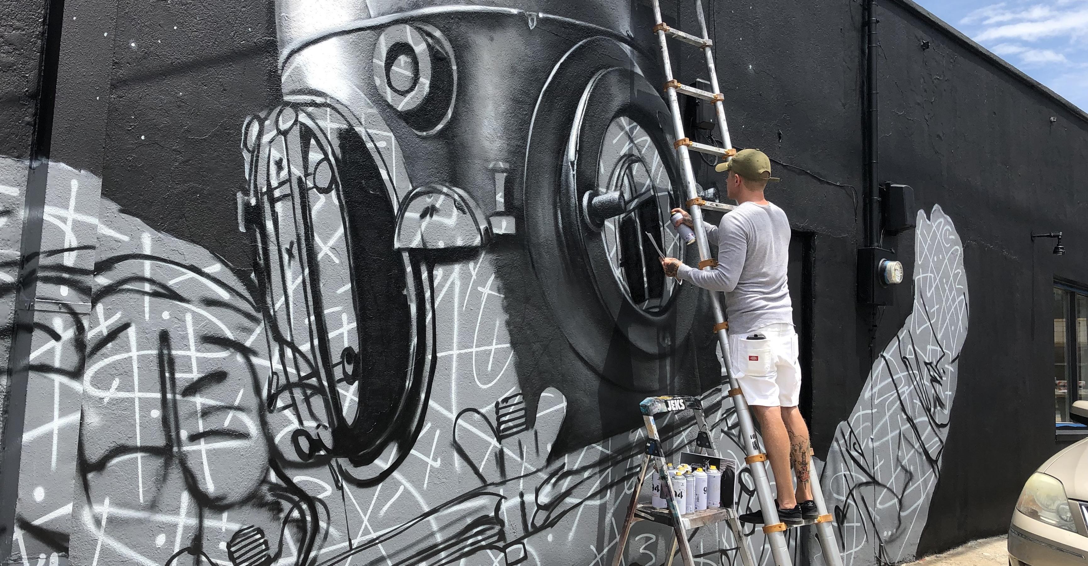 Photo by Jerry Cooper (A Jeks painting commissioned by Hoots Beer Company of a scuba diver, wearing a nautical vintage diving helmet, floating through space)