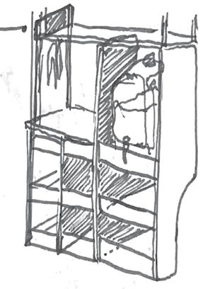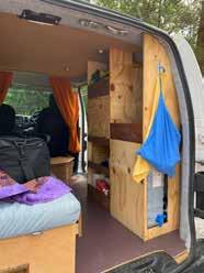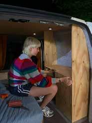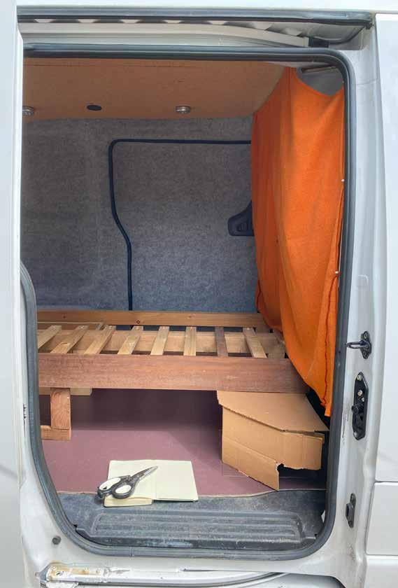 The shelving unit, with a drop down table and water storage, had to be built to fit the tight constraints and particular geometries of the interior of the van. A lot of trial and error, cutting and re-cutting was done for it to fit precisely.