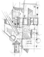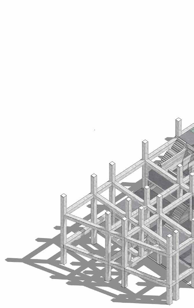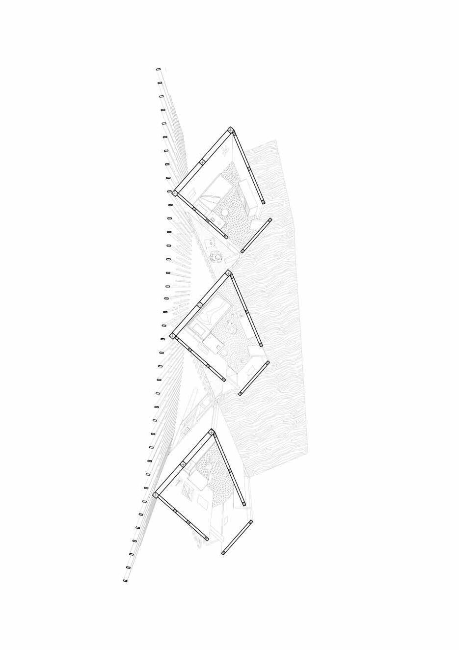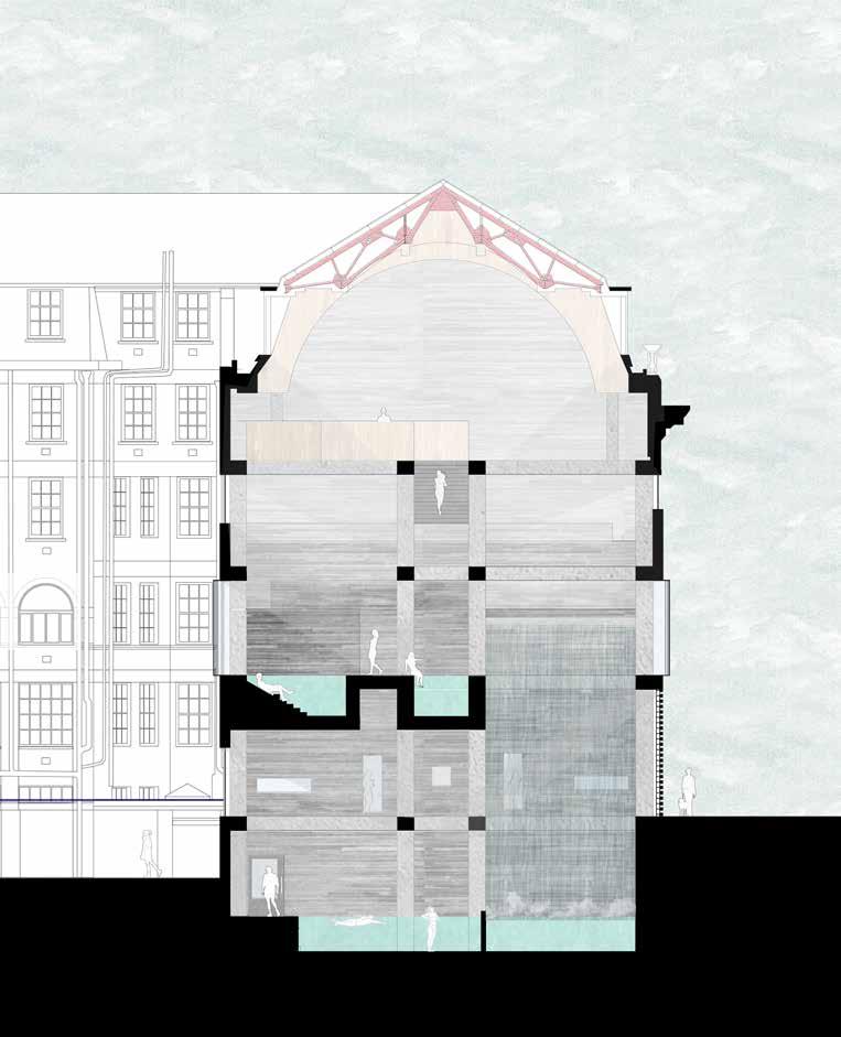 a partial sectional perspective which looks at the water as it decends through the pools with the users, starting from hot and cooling as moves downwards.
