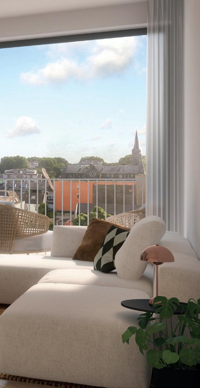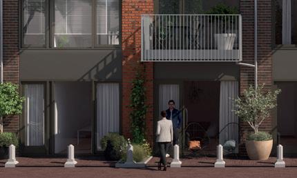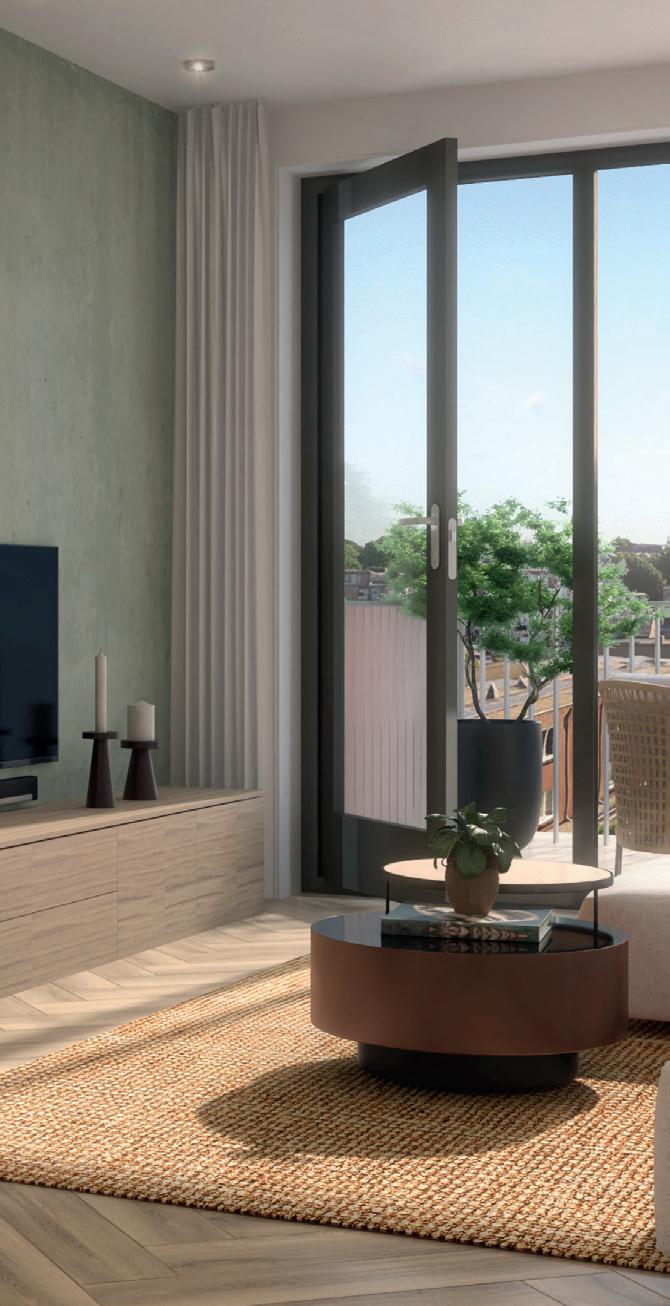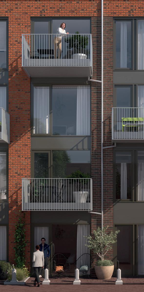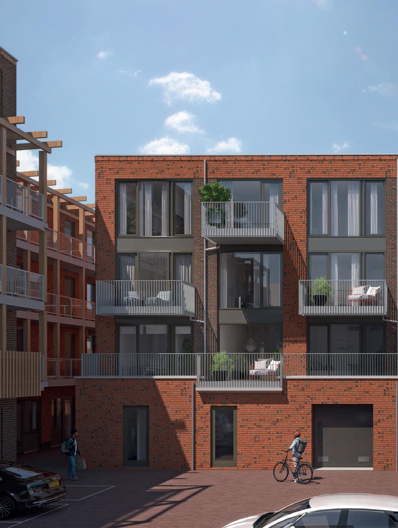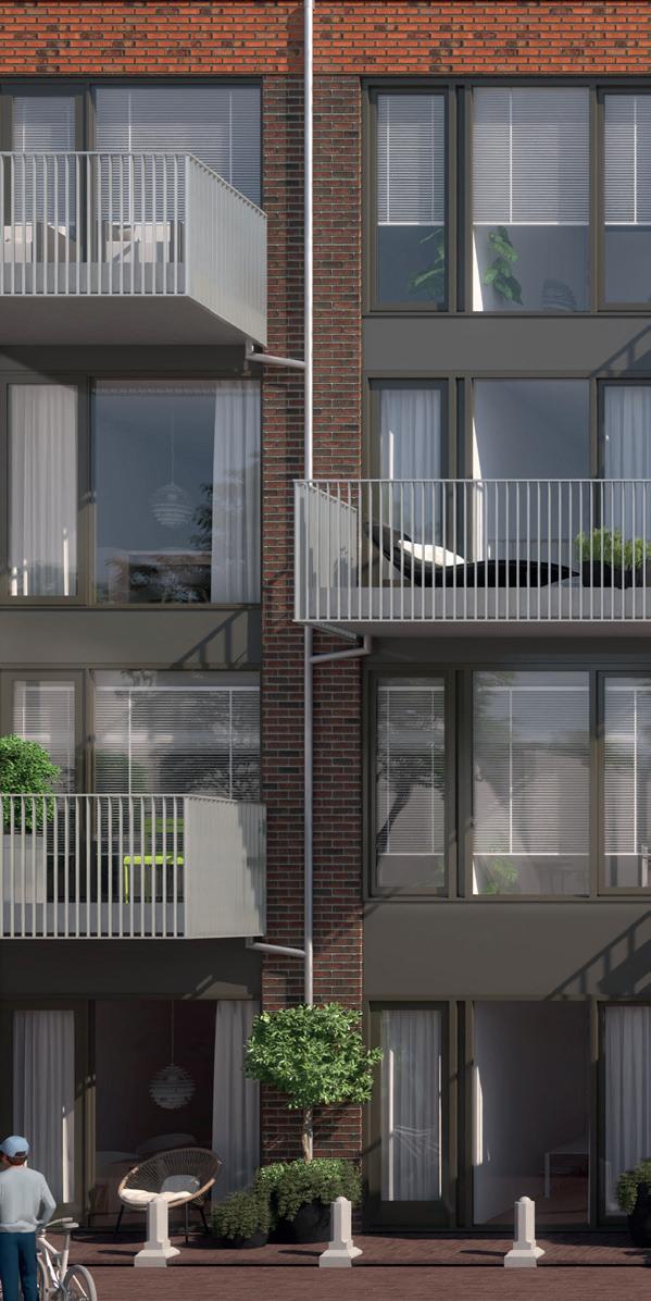 bedrijfsruimtes. Doordat er dan geen licht van de achtergevels naar binnen zou komen, besloot de architect de voorzijde extra breed en licht te maken. “Zo ontstonden appartementen van circa 63,8 m² met grote raampartijen. Ook de bedrijfsruimtes in de plint van circa 63,8 m² hebben veel glas in de voorgevel voor extra lichtinval. Beiden zijn efficiënt ingericht, waardoor je relatief veel ruimte hebt”, vertelt Jan.