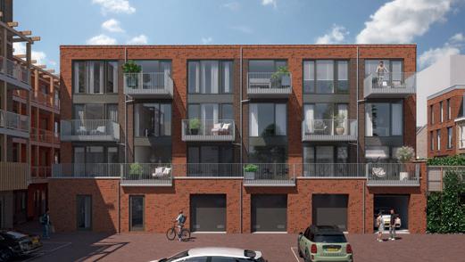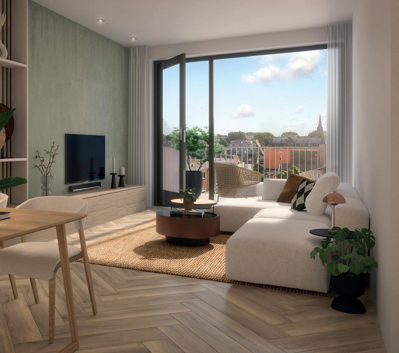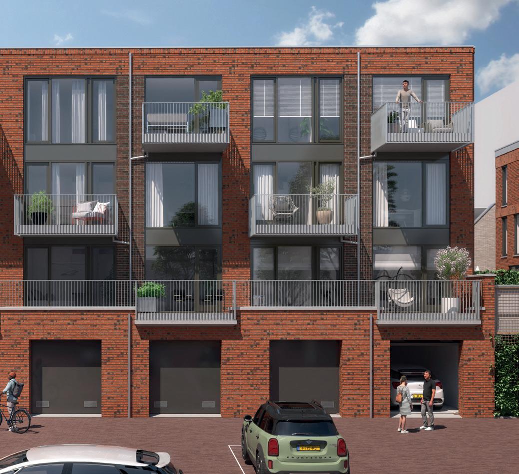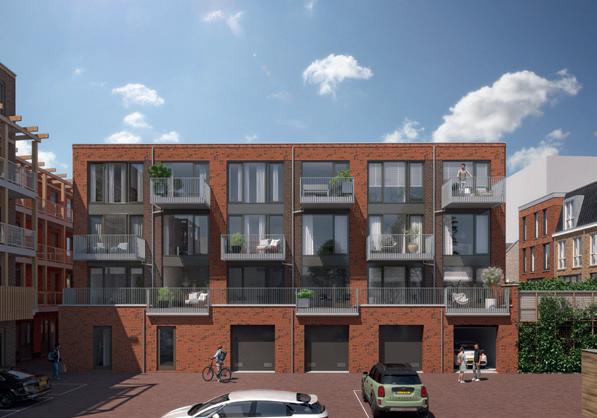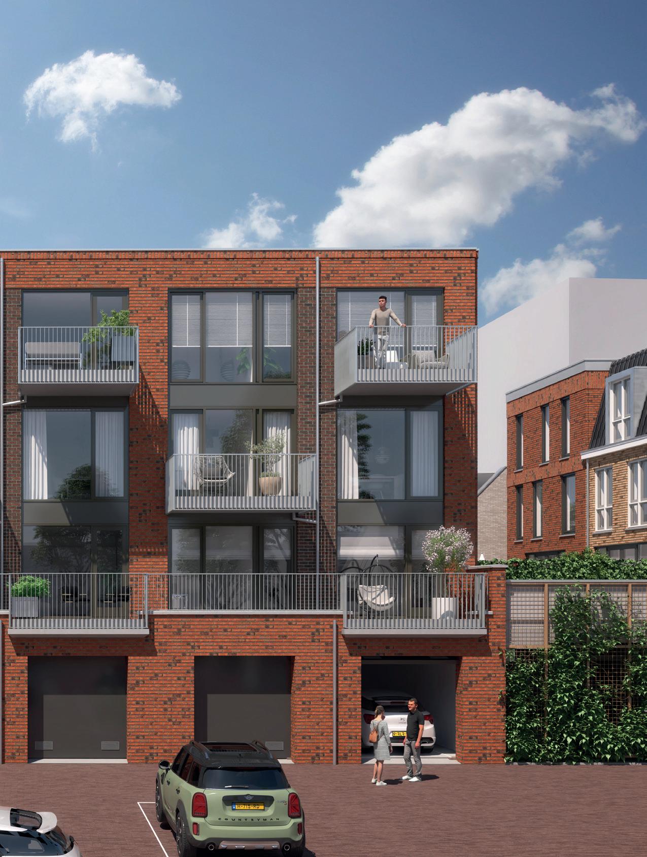 bedrijfsruimtes. Doordat er dan geen licht van de achtergevels naar binnen zou komen, besloot de architect de voorzijde extra breed en licht te maken. “Zo ontstonden appartementen van circa 63,8 m² met grote raampartijen. Ook de bedrijfsruimtes in de plint van circa 63,8 m² hebben veel glas in de voorgevel voor extra lichtinval. Beiden zijn efficiënt ingericht, waardoor je relatief veel ruimte hebt”, vertelt Jan.