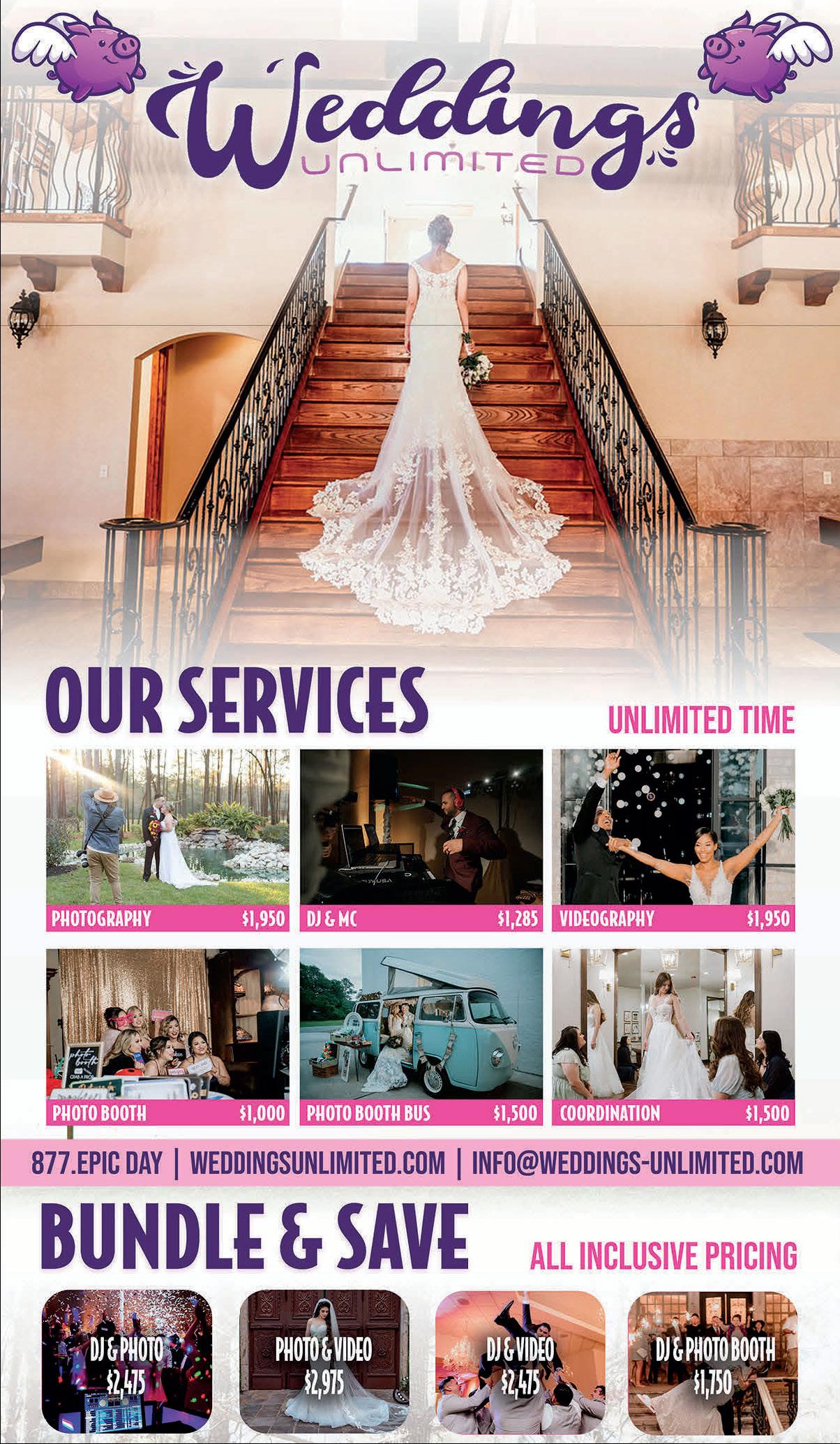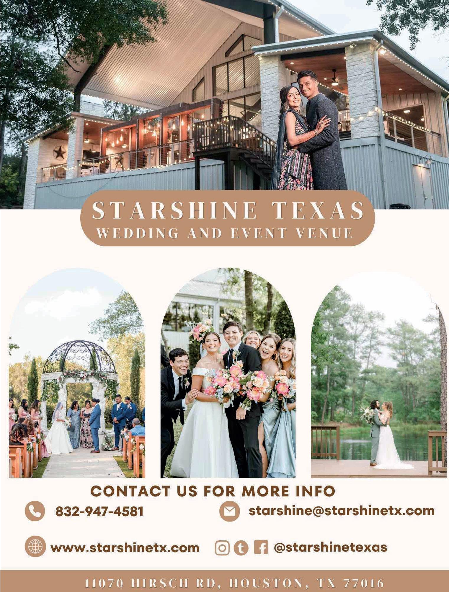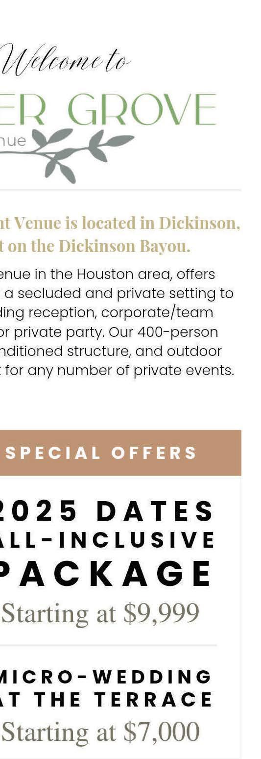 Begin yourhappily-ever-after at the Pavilion at Lago Bella, where rustic charm meets timeless elegance.Host your dream weddingin a stunning7,200sq. ft. indoor pavilion or undera romantic gazebo on a private lake. Nestled in North Houston’s lush Piney Woods,this 58-acre property offers breathtakingbackdrops for unforgettablemoments.Begin your forever at Lago Bella.
