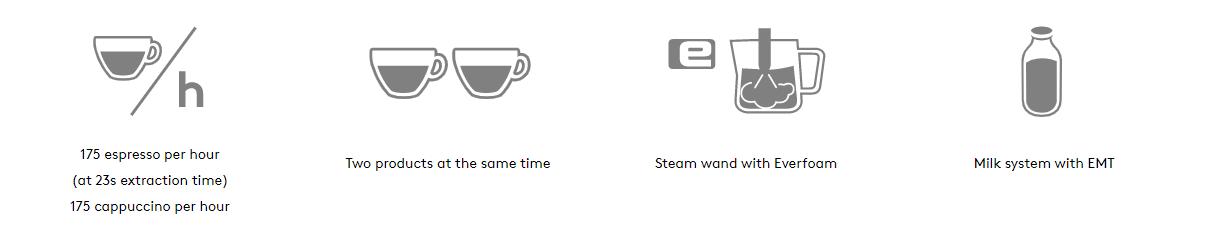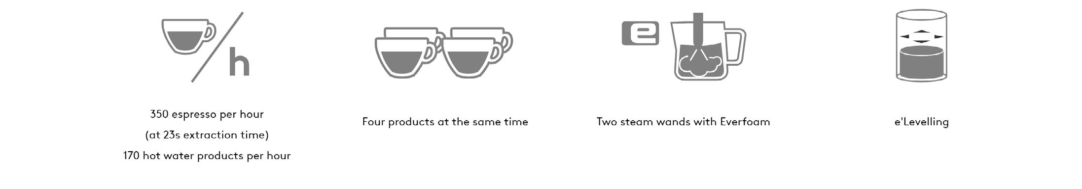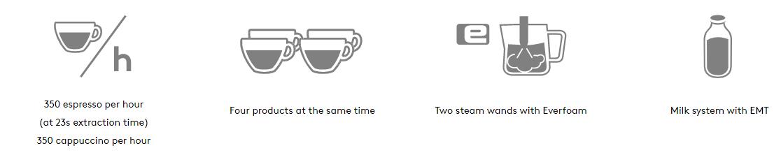 Designed for sites where high volumes of super premium quality drinks are required with minimal skill. The E’4s/ST is a 56cm wide machine conceived to produce 4 espresso based drinks at the same time and 350 espressos per hour. Tea and continuous steam can be produced concurrently, you will never run out of capacity with the E’4s/ST.