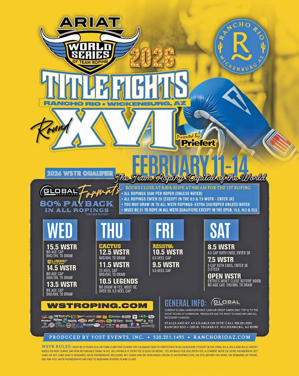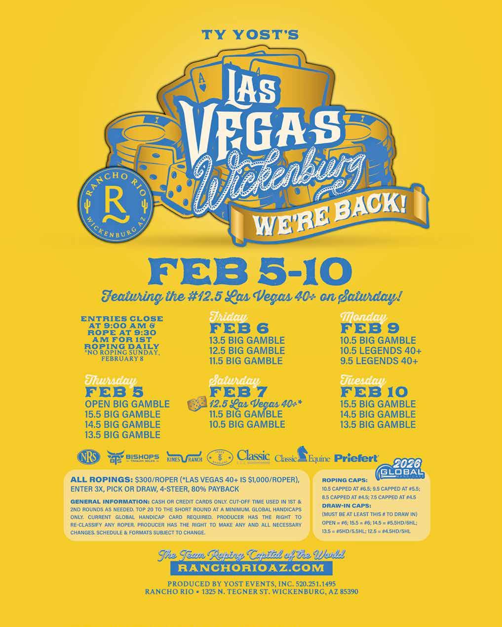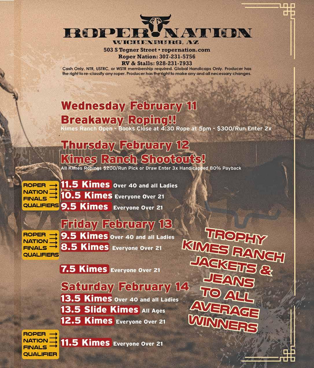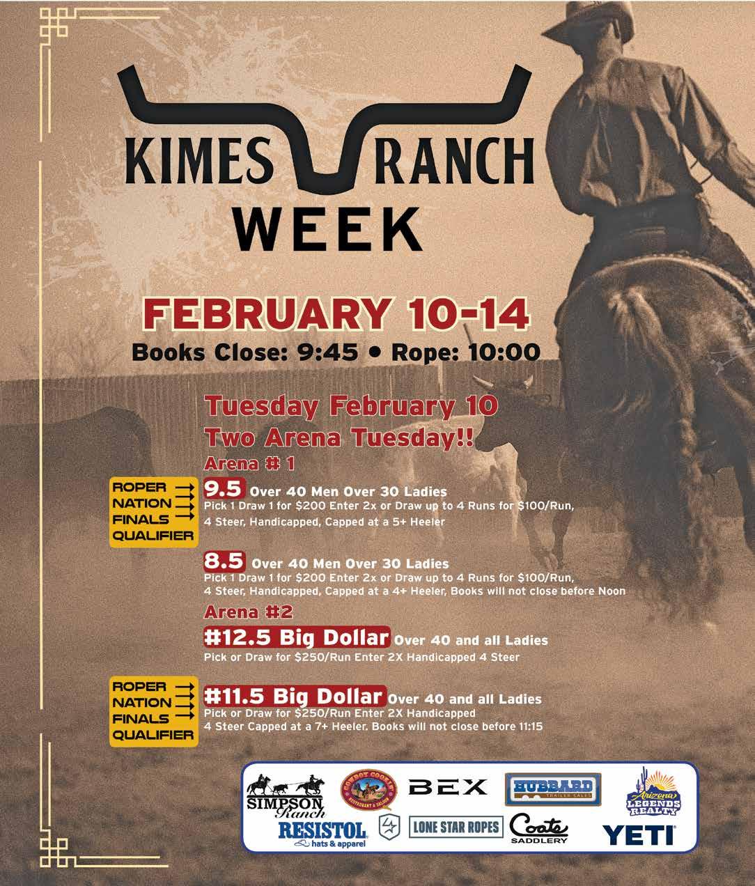 Two arenas, multiple divisions, and a schedule that never drags Kimes Ranch Week starts fast with “Two Arena Tuesday” on February 10, and it’s a smart way to set the tone. While many events ease into the week, Roper Nation uses two arenas to deliver volume and variety immediately. Competitors can find their fit across divisions that include 9.5 and 8.5 ropings tailored to experienced age-and-ladies groupings—Over 40 Men and Over 30 Ladies—along with “Big Dollar” options that speak to higher-level competitors and those looking to take bigger swings early. That two-arena structure matters in Wickenburg, because it respects the reality of hauling in: time is money, horses need schedules, and ropers want to rope. The format keeps the day efficient without sacrificing quality. If you are the kind of competitor who wants options—run a few times, move divisions, keep a horse fresh, or capitalize on a good draw—this layout gives you room to do it.