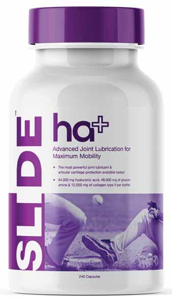 acid synthesis), 5,000 mg of glucosamine HCL, 5,000 mg of hydrolyzed collagen and 2,000 mg of unhydrolyzed collagen type II (this is the major collagen found in articular cartilage and intervertebral discs of the spine. SLIDE™ is the only equine hyaluronic acid supplement that contains this im-portant form of collagen). None of the ingredients are banned substances for equine competition.