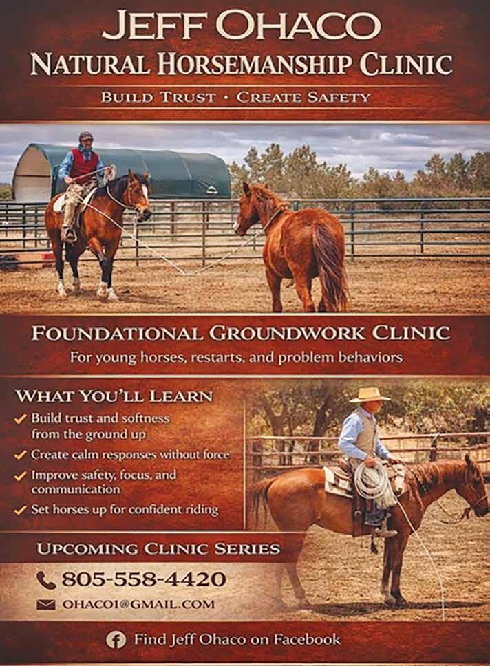 The Horsemanship Series with Leanne Wildman offers focused, goal-based training designed to help riders fix bad habits, improve control, build confidence, and strengthen horse-andrider communication. Each clinic runs from 1–4 p.m. at Reigning Grace Ranch, with upcoming dates including Nov. 23rd, Dec. 14th, Jan. 18th, Feb. 15th, March 29th, and April 19th. Riders bring their own horses for individualized instruction in a supportive environment. Registration is $200 per session. Call (707) 888-8951 or visit LMWHorsemanship.com.