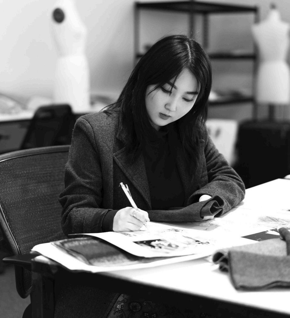 Kim:“When I make mydesigns, I make a little doodlewhile I'm sketching Sometimes,that doodle becomes my print design ideas. I make a sample and distressthe materials by handtosee howthey react and oncesomething catches my eye, Itranslatethat intothe morestructuredform: draping onthedressform, adjustingthe proportions, andfinding balance between roughness and refinement Then, I just keep editing, editing, editing, and eventuallythe finished product comes about ”