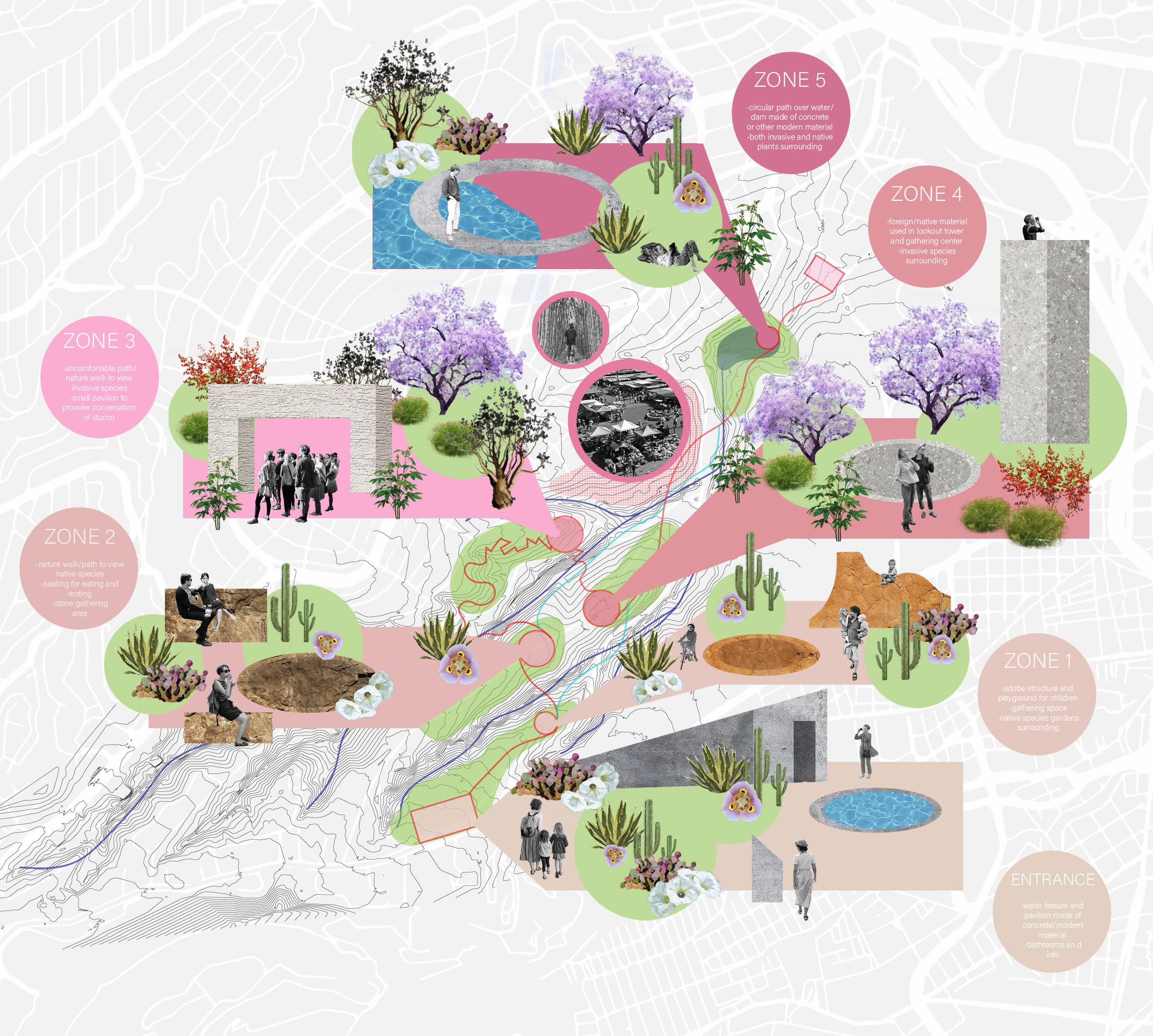 Phase two of the studio dives into an individual site development. The site intervention proposal aims to create a communal space showcasing Mexican culture through an open air theater inspired by Aztec art and architecture. A terraced garden reintroduces native plant species that have been taken over by invasive species throughout the park, while simultaneously creating a space for rest and relaxation.