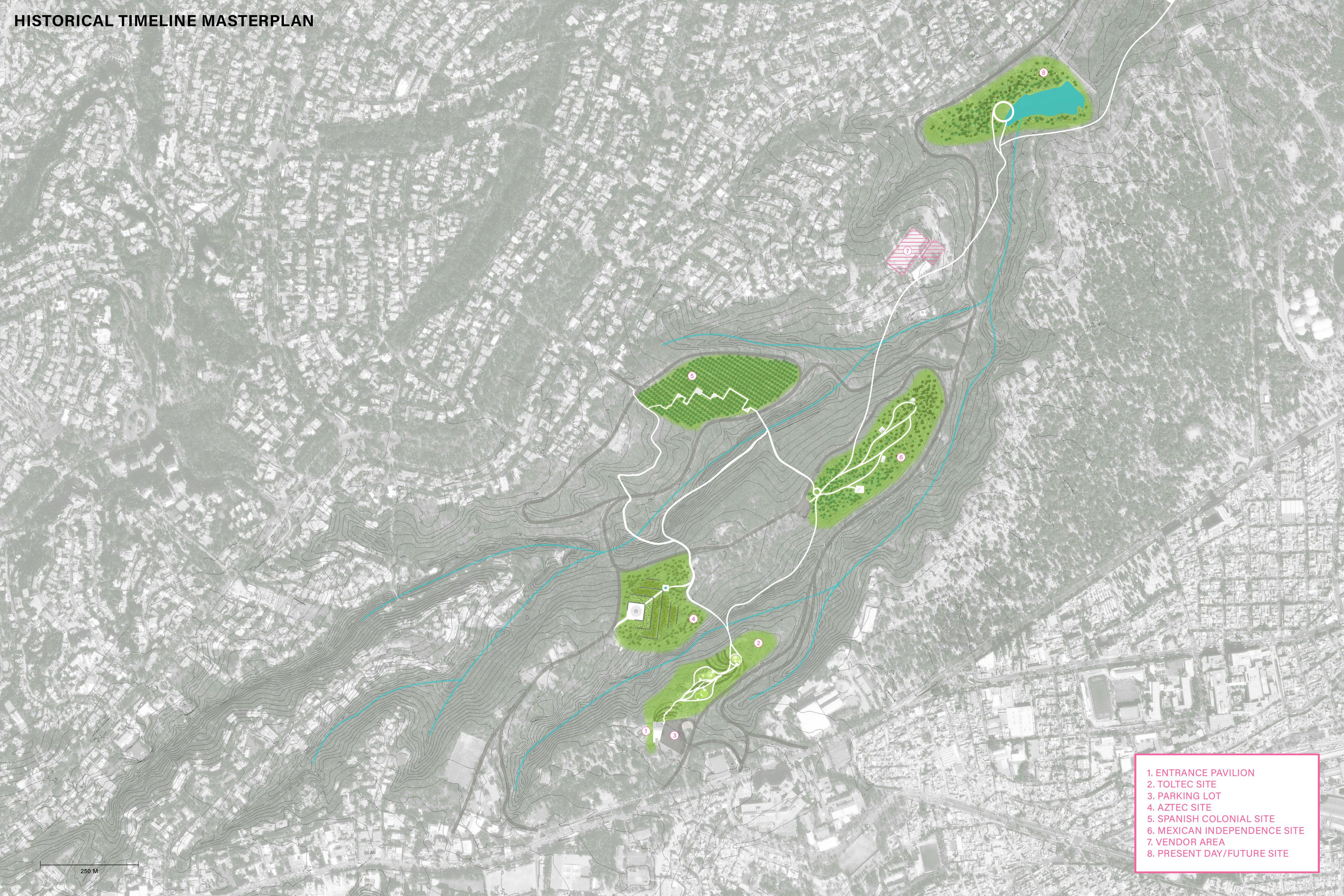 37 Chapultapec Park Section 3 Masterplan Proposal 1. Entrance Pavilion 2. Toltec Site 3. Parking 4. Aztec Site 5. Spanish Colonial Site 6. Mexican Independence Site 7. Vendor Area 8. Present Day Future Site 250 m Final masterplan with location of site for further development
